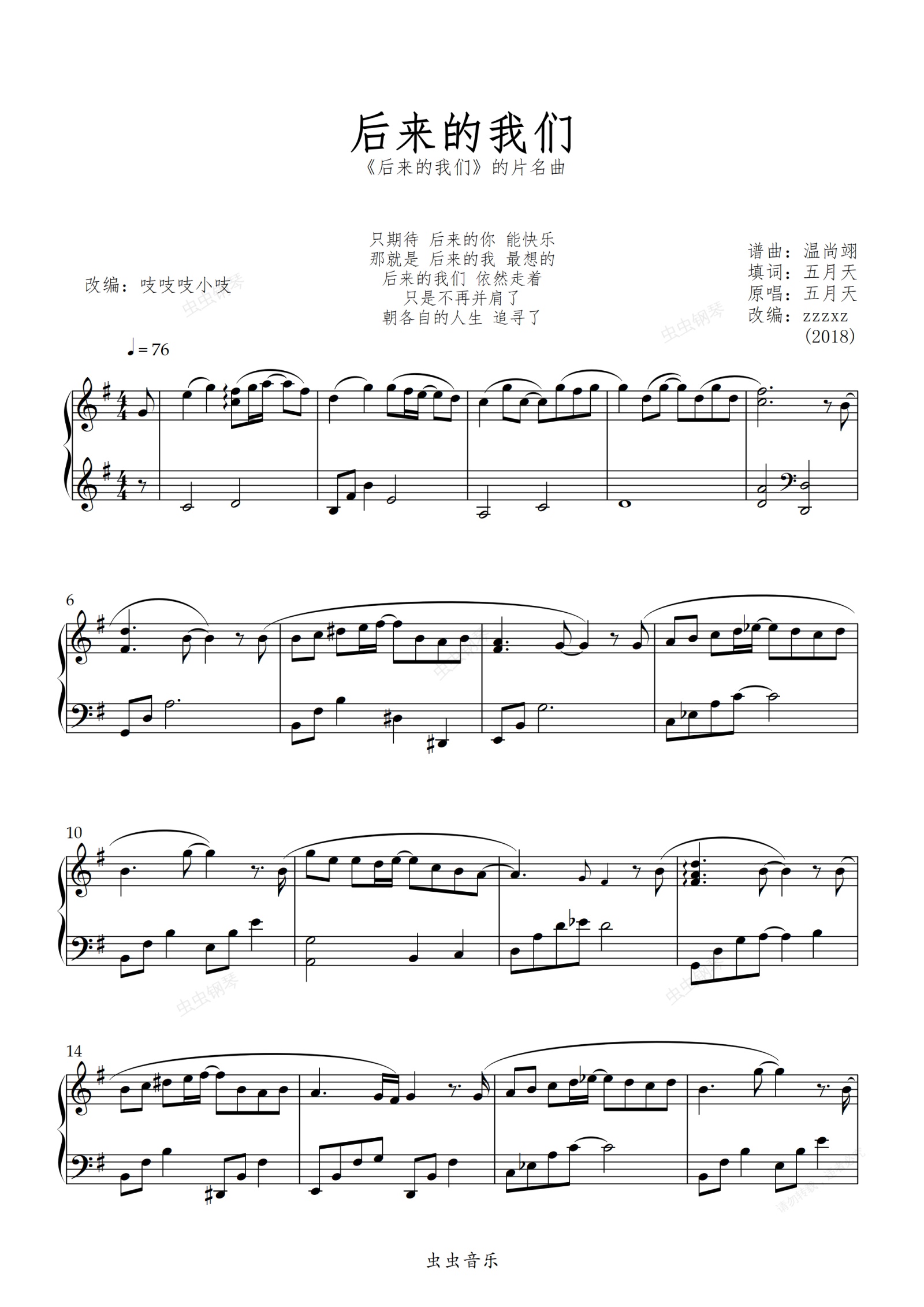 钢琴谱:后来的我们-G-五月天 【初级难度】 吱吱编配