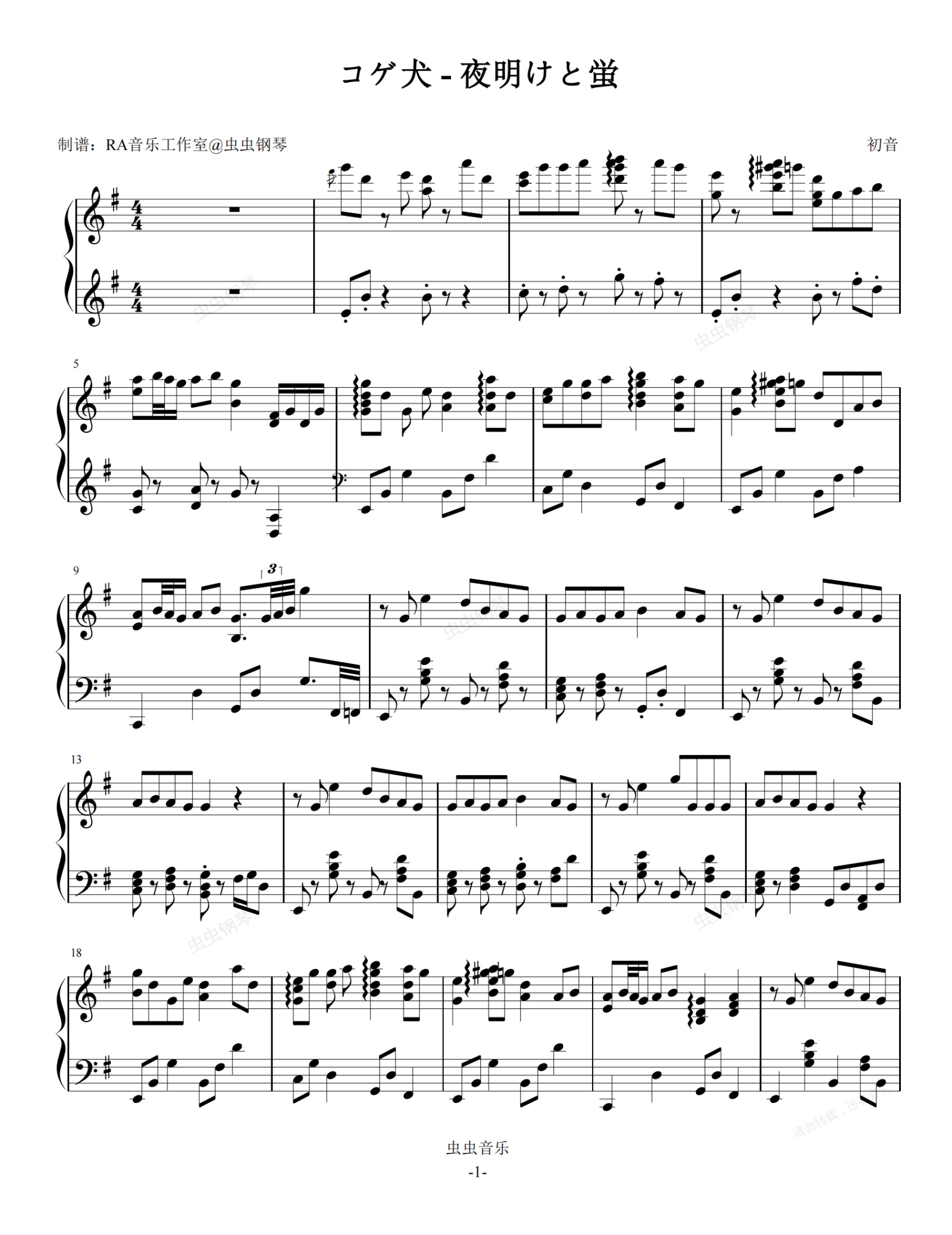 钢琴谱:<夜明けと蛍>-初音-钢琴演奏谱 コゲ犬版
