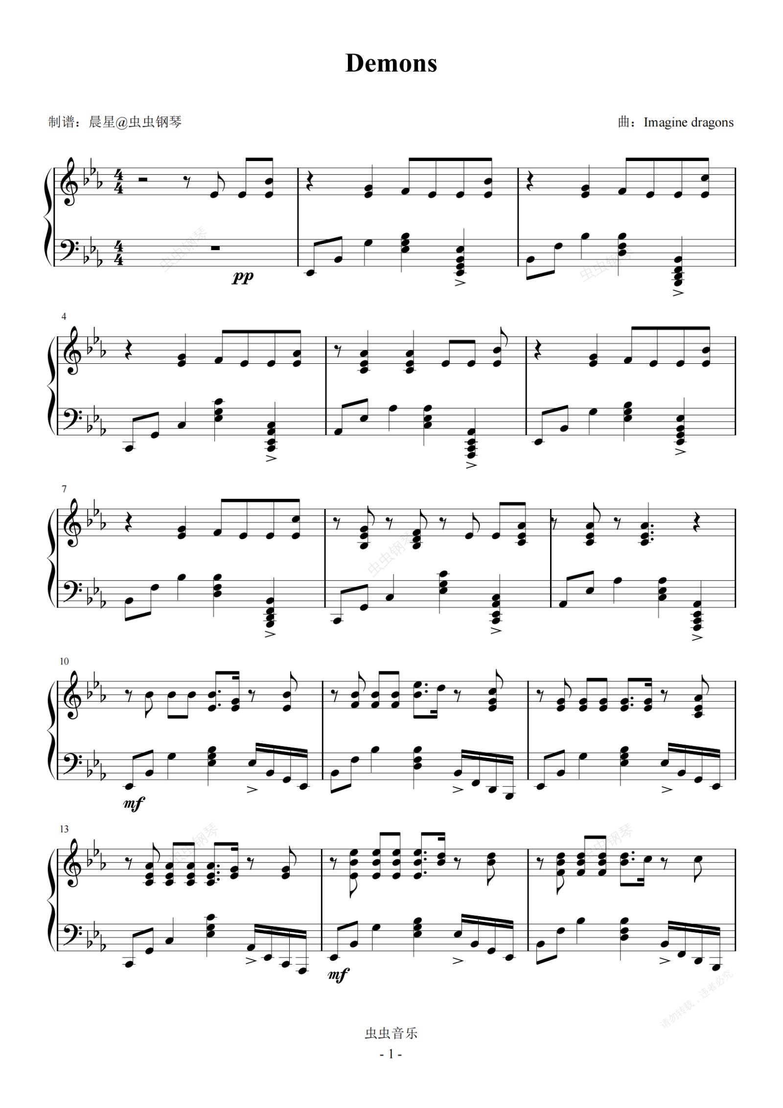 钢琴谱:Demons-Imagine Dragons-晨星-原调还原版