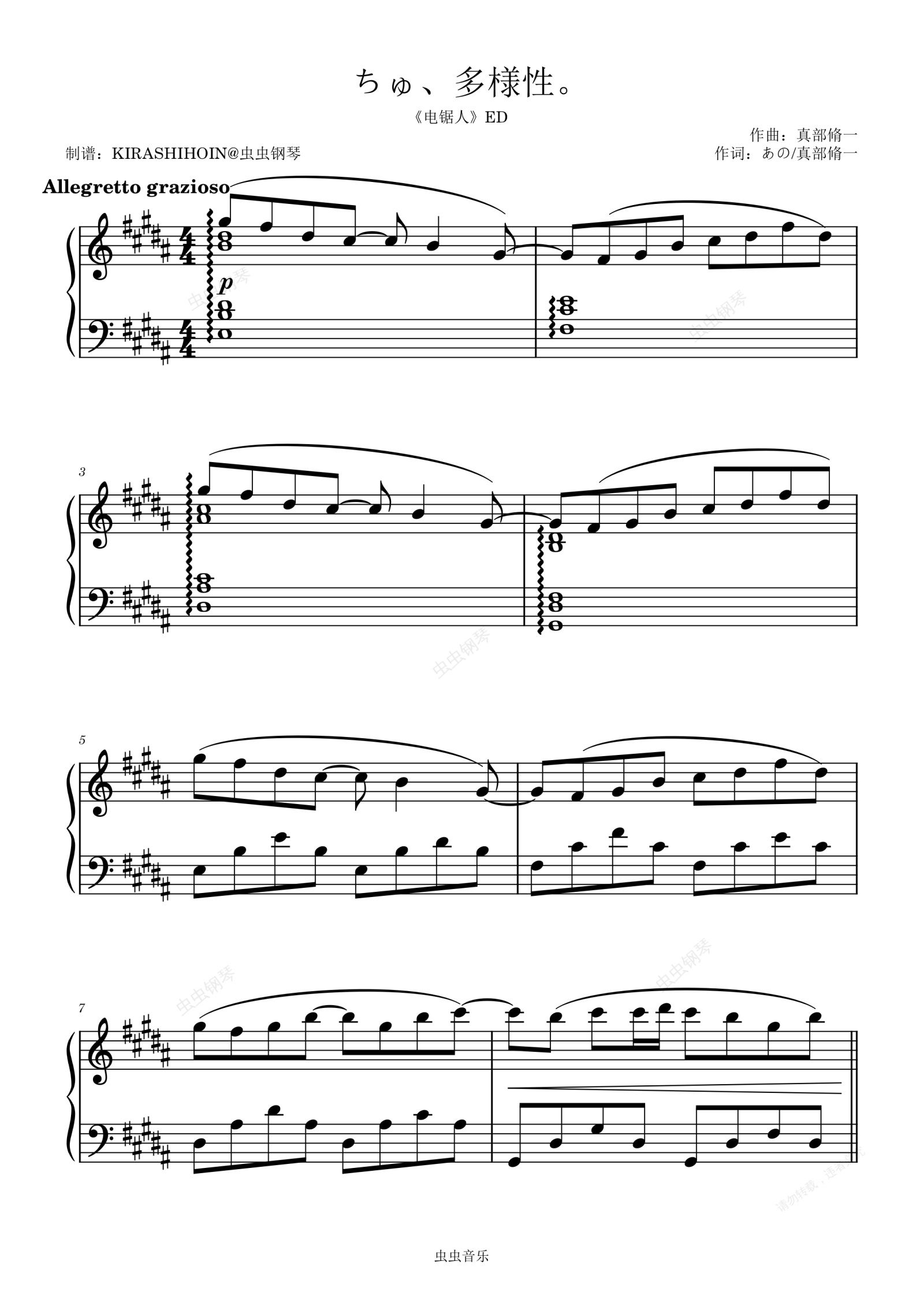 钢琴谱:ちゅ、多様性。(《电锯人》ED/片尾曲)- ANO
