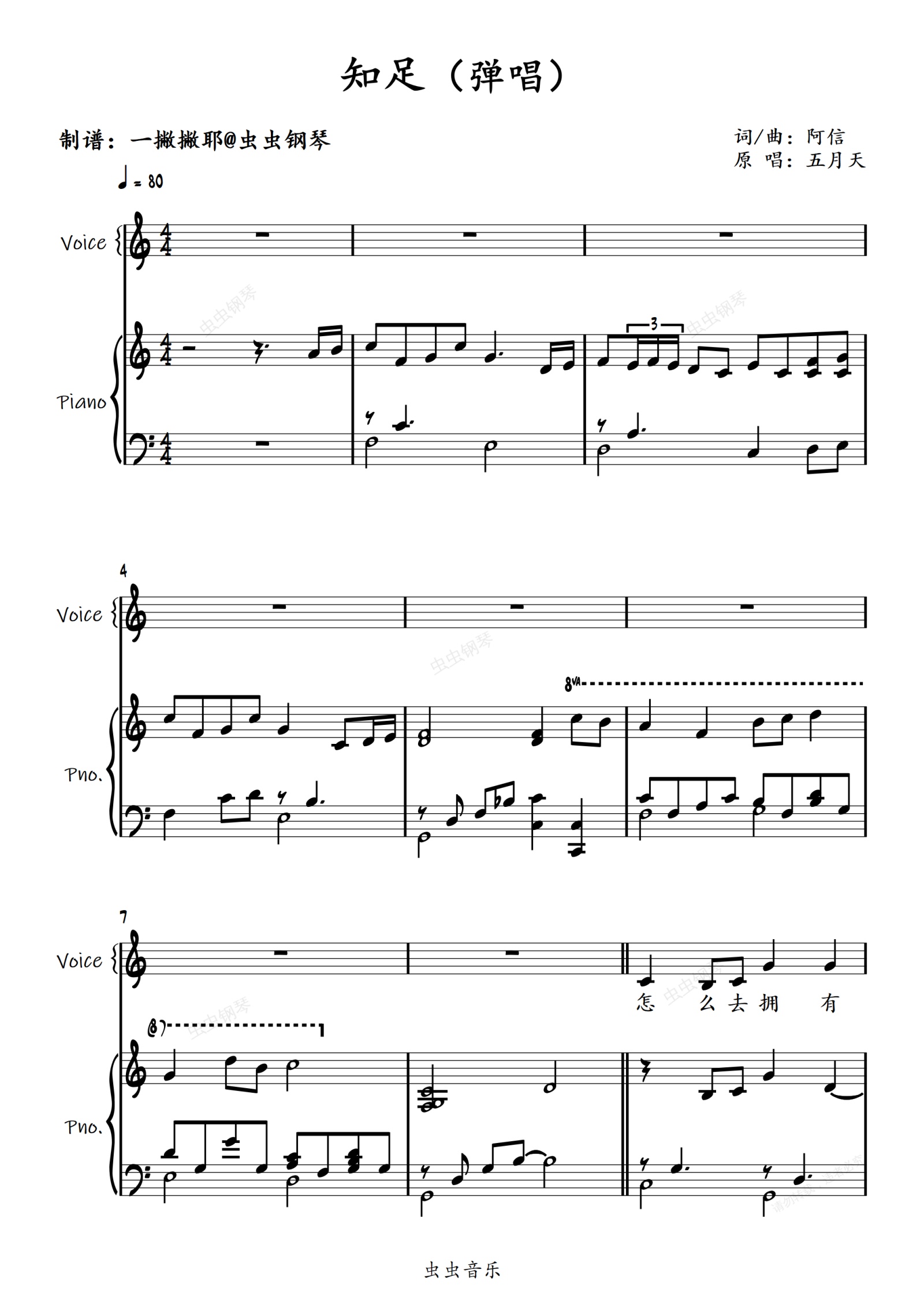 钢琴谱:C调女版弹唱《知足》五月天「一撇撇耶」