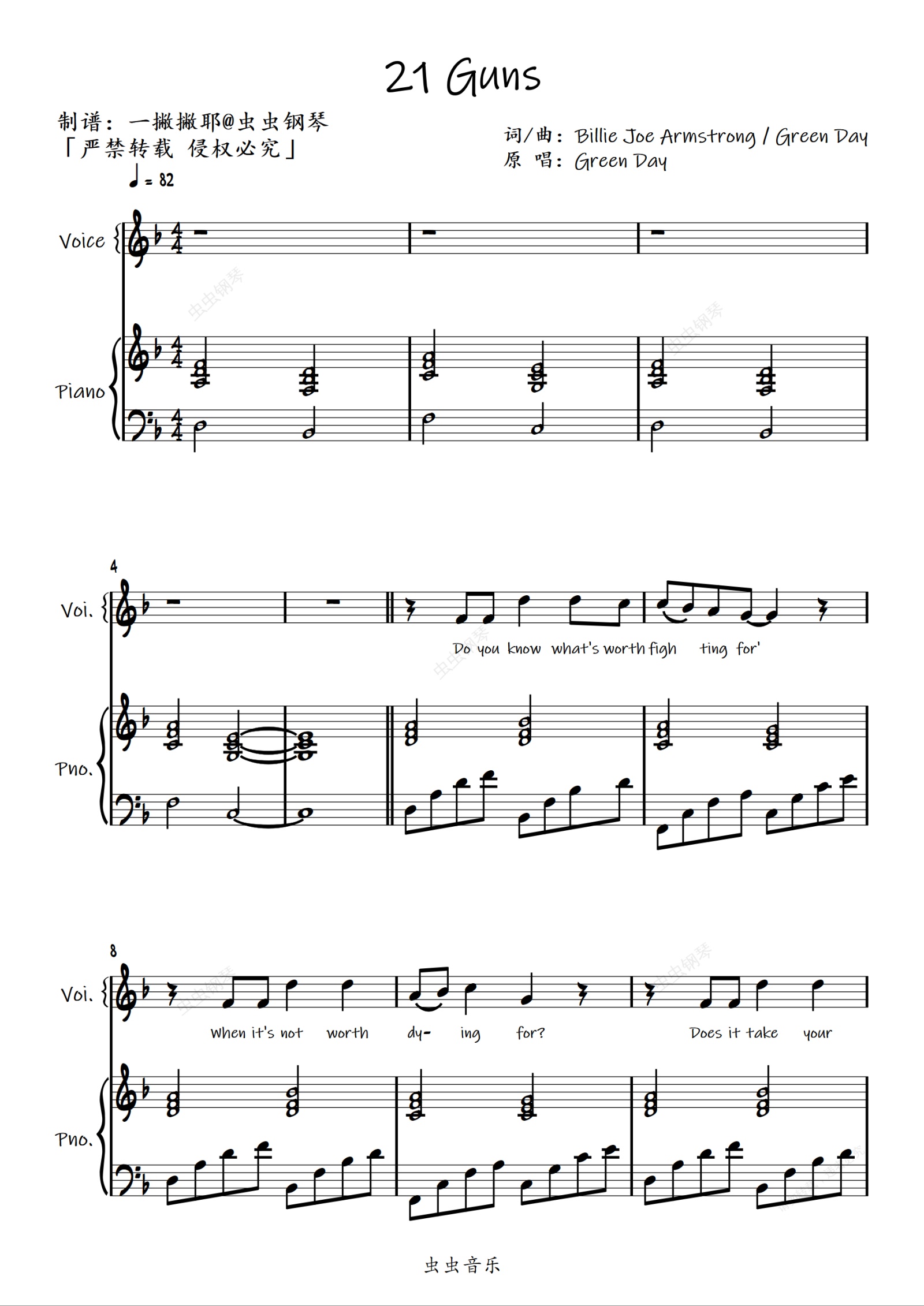 钢琴谱:升调女版弹唱《21 Guns》Green Day「一撇撇耶」