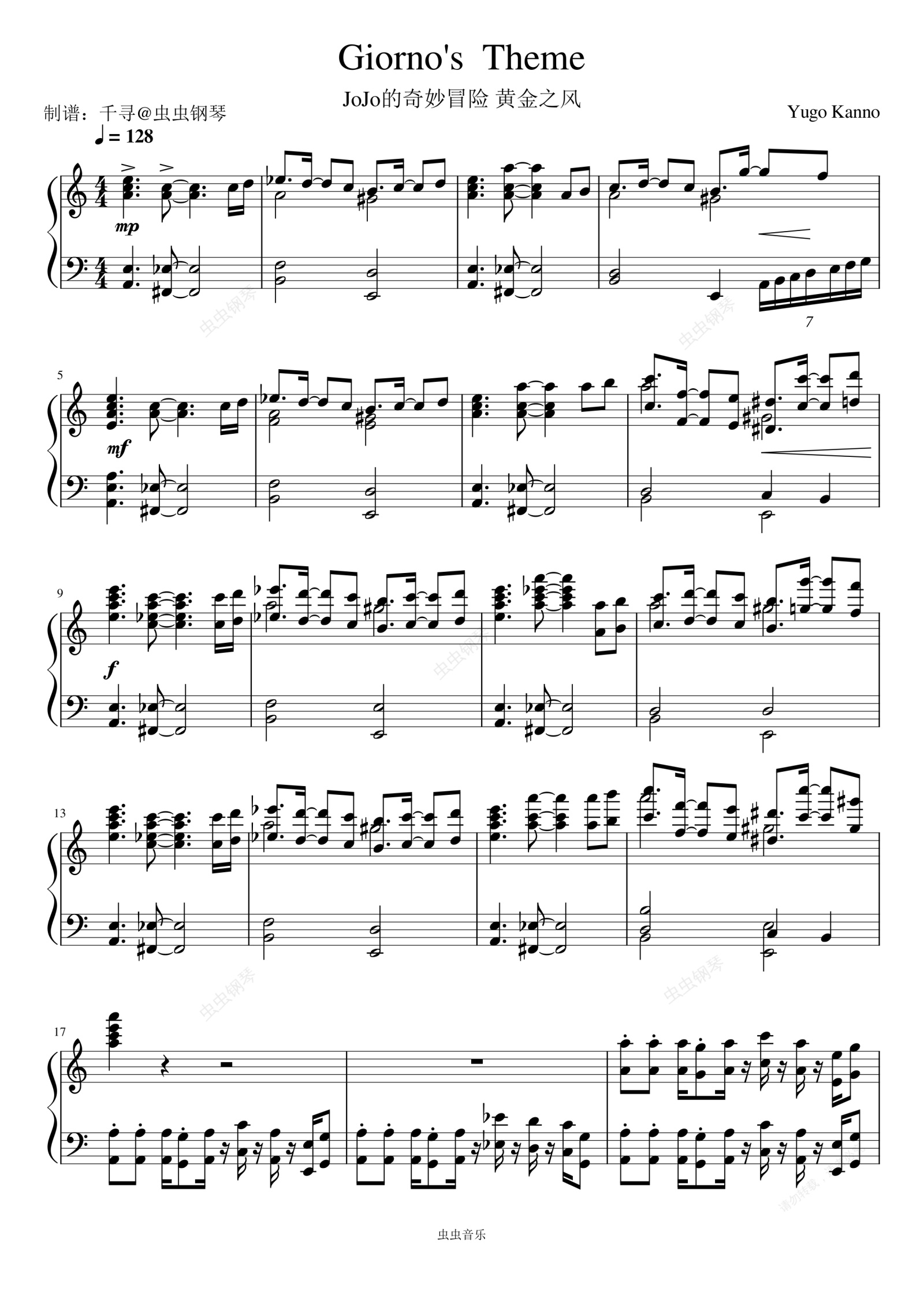 钢琴谱:JoJo的奇妙冒险 黄金之风-Giorno's Theme【C调】