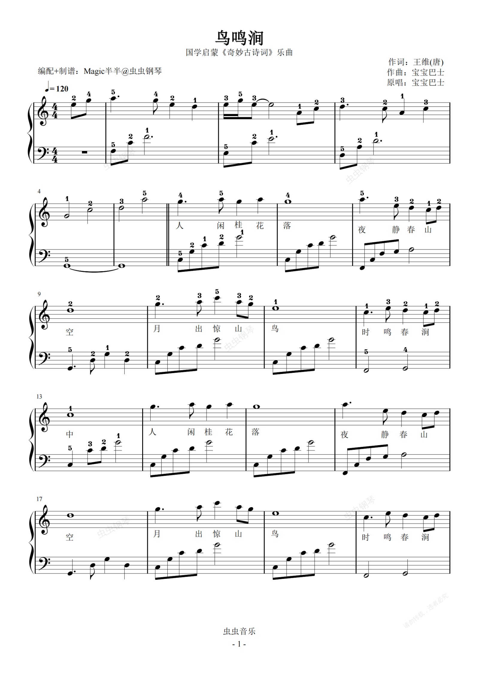 钢琴谱:奇妙古诗词/鸟鸣涧(带指法)