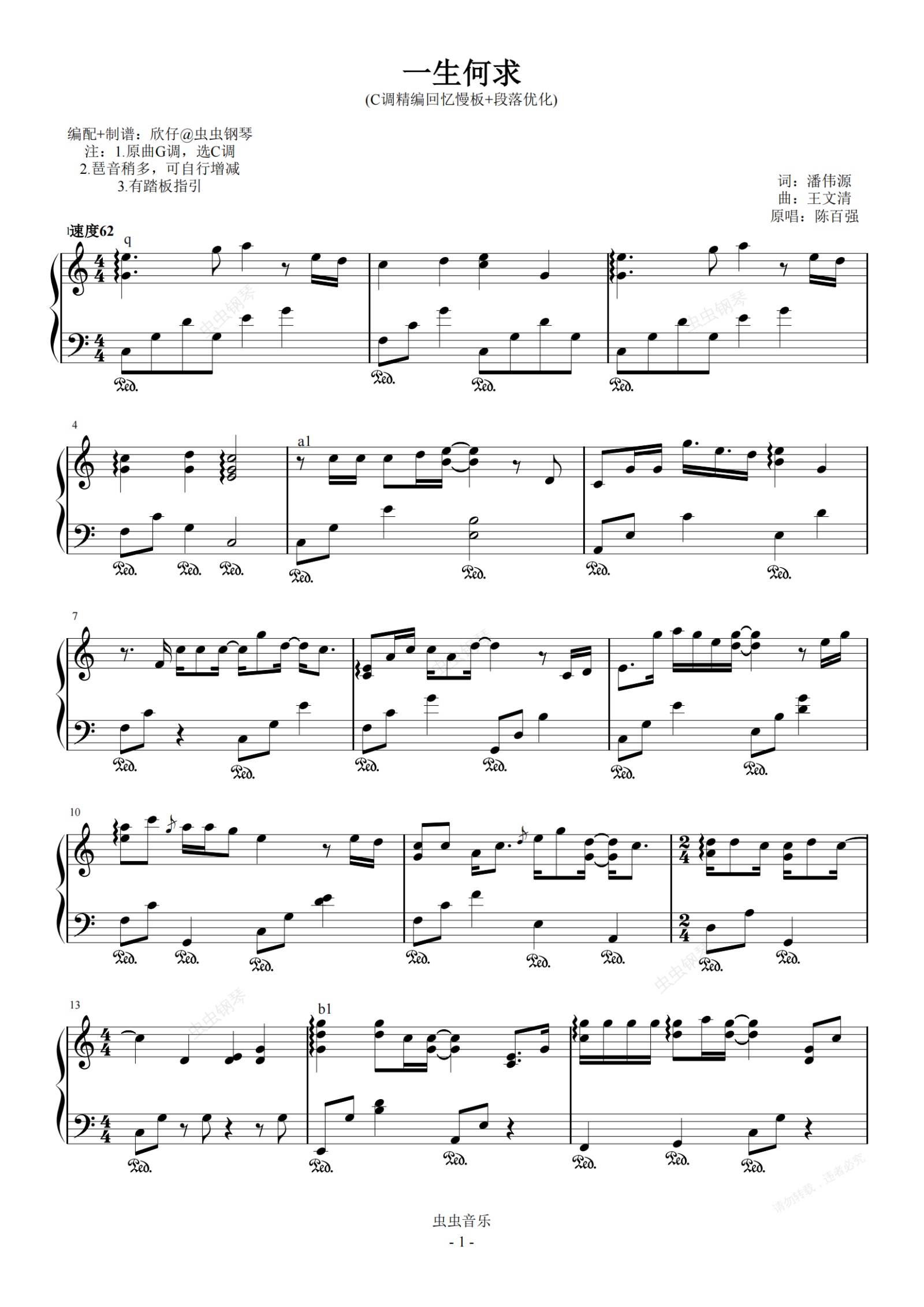 钢琴谱:陈百强-C《一生何求》(精编回忆慢板+段落优化)