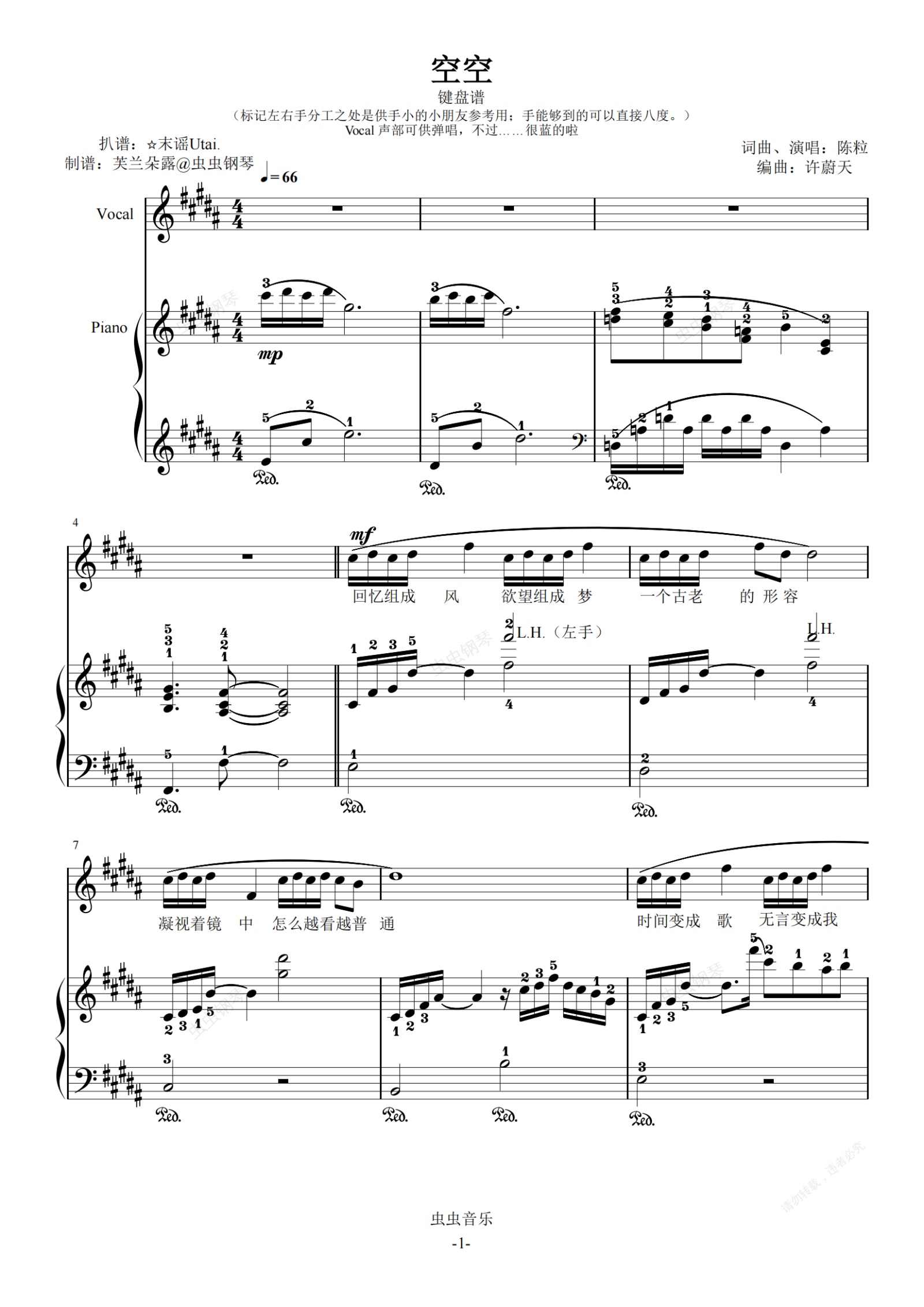 【陈粒】空空 (Live) 键盘谱弹唱谱 带指法