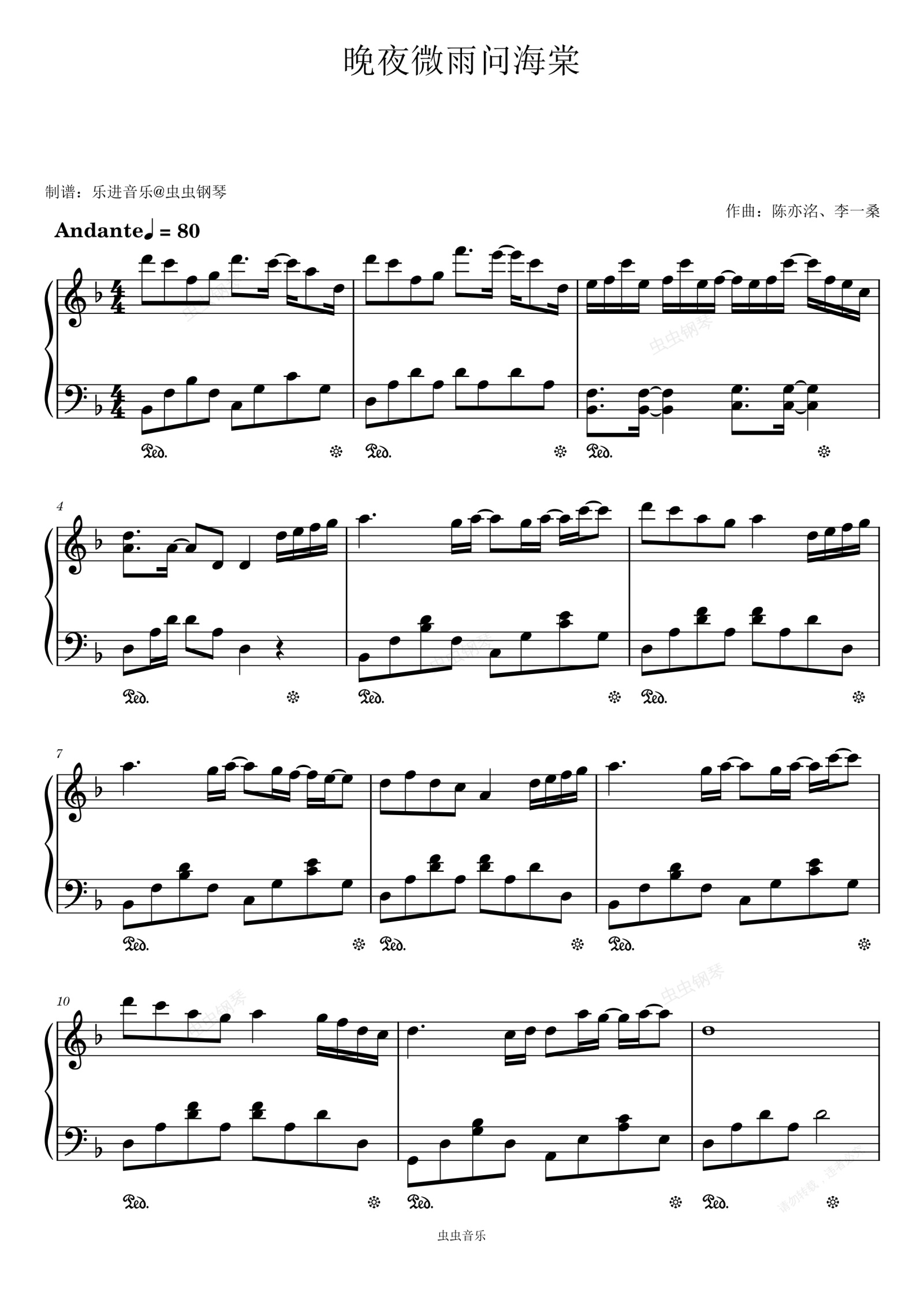 钢琴谱:《晚夜微雨问海棠》F调简易版