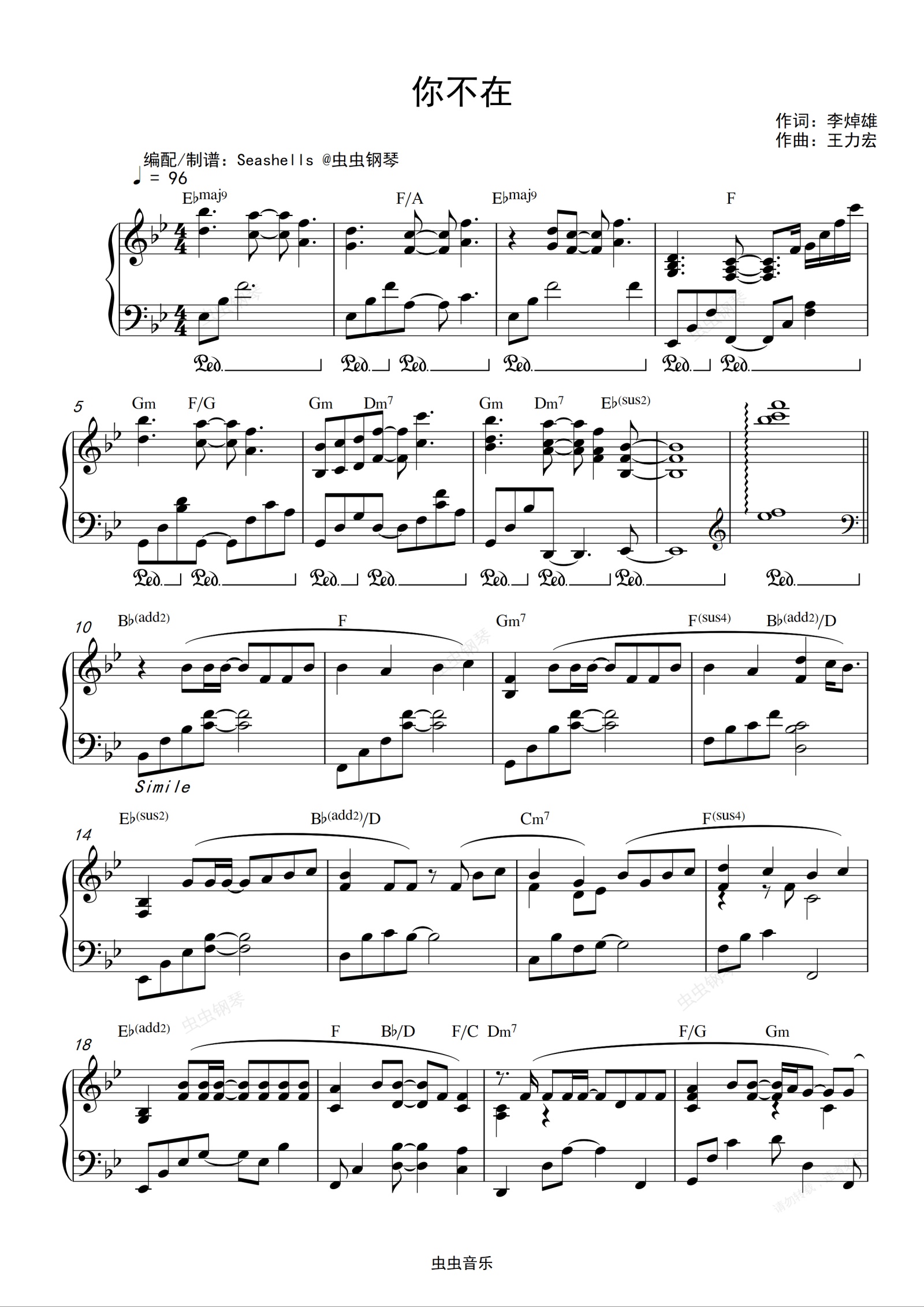 钢琴谱:王力宏-《你不在》精编钢琴独奏