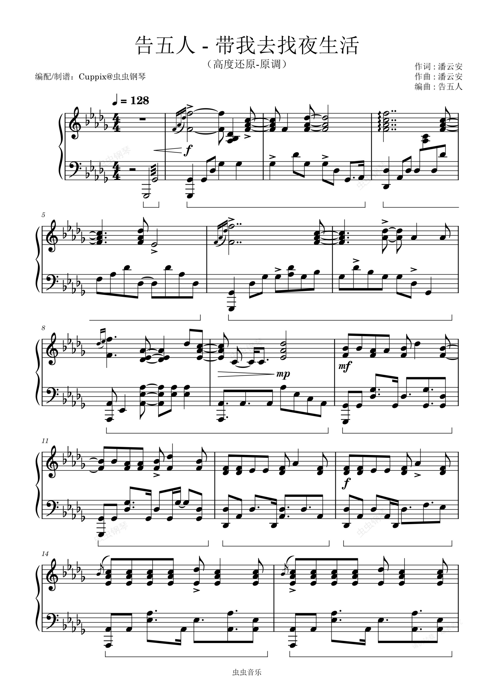 钢琴谱:《带我去找夜生活》Cuppix编配-原调(告五人)