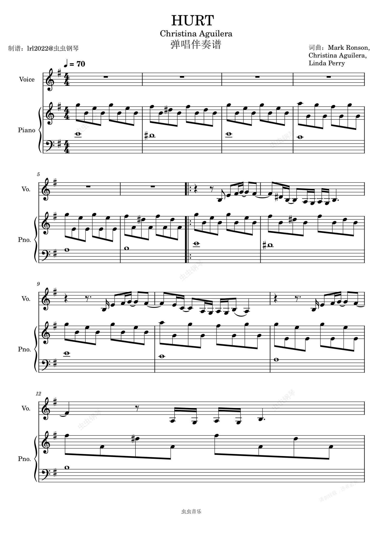 钢琴谱:Hurt-Christina Aguilera-伴奏弹唱谱