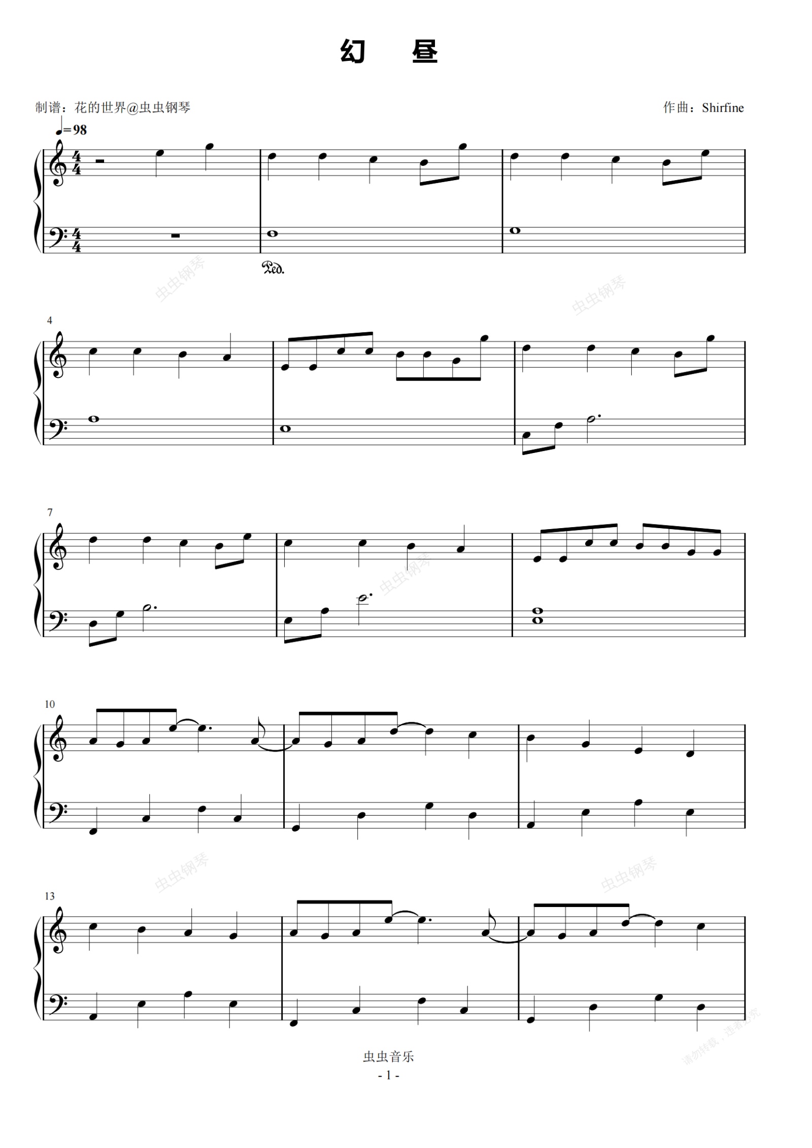 钢琴谱:幻昼 C调简单版