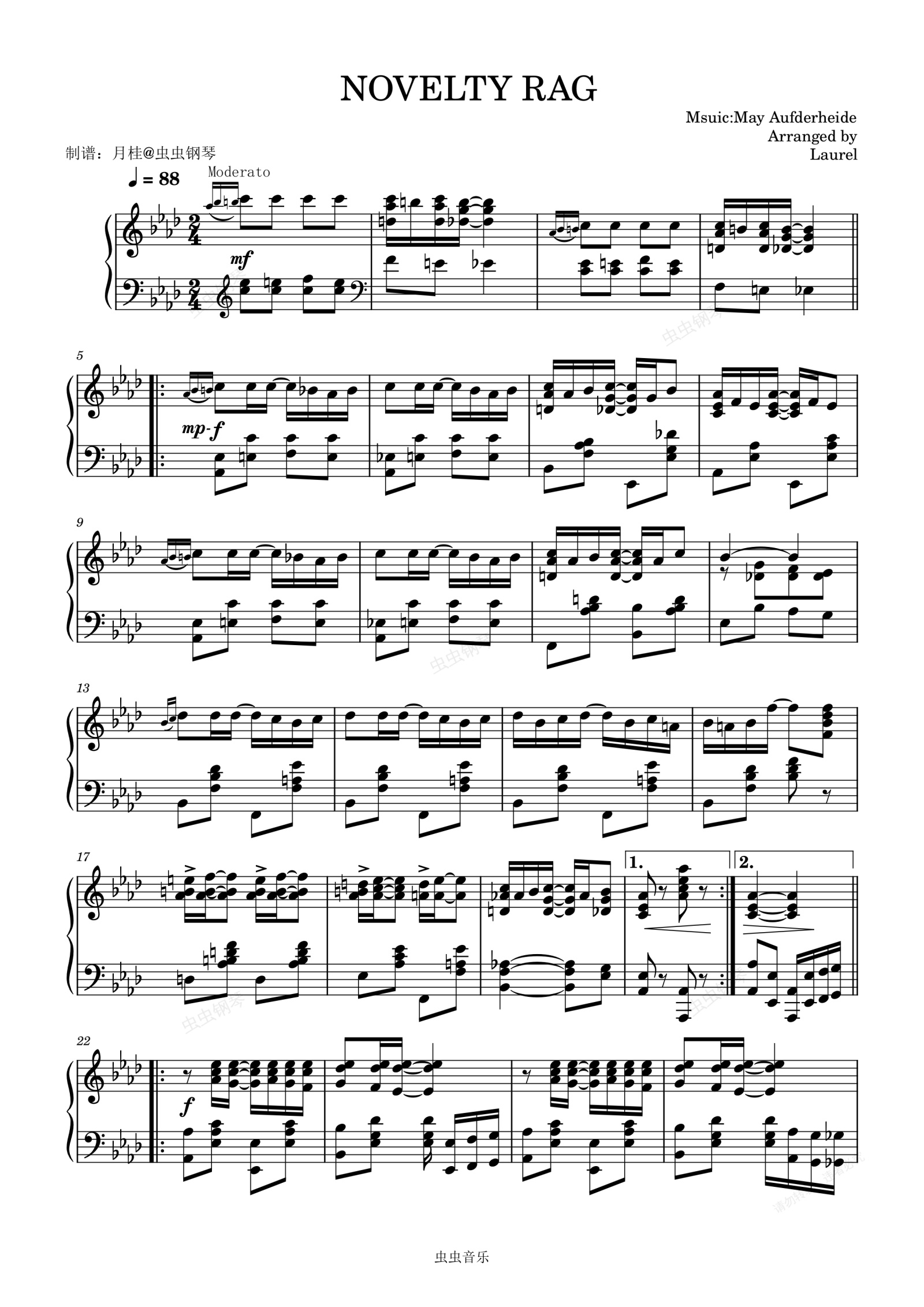 经典拉格泰姆()乐曲《 Rag》,由女性作曲家May创作于1911年。拉格泰姆,美国流行音乐形式之一,为美国历史上第一个真正意义上的黑人音乐。产生于19世纪末,采用黑人旋律,依切分音法()循环主题与变形乐句等法则,结合而成的早期爵士乐,盛行于第一次世界大战前美国经济十分繁荣时期。发源于圣路易斯与新奥尔良,而后美国的南方和中西部开始流行,它影响了新奥尔良传统爵士乐的独奏与即兴演奏风格。