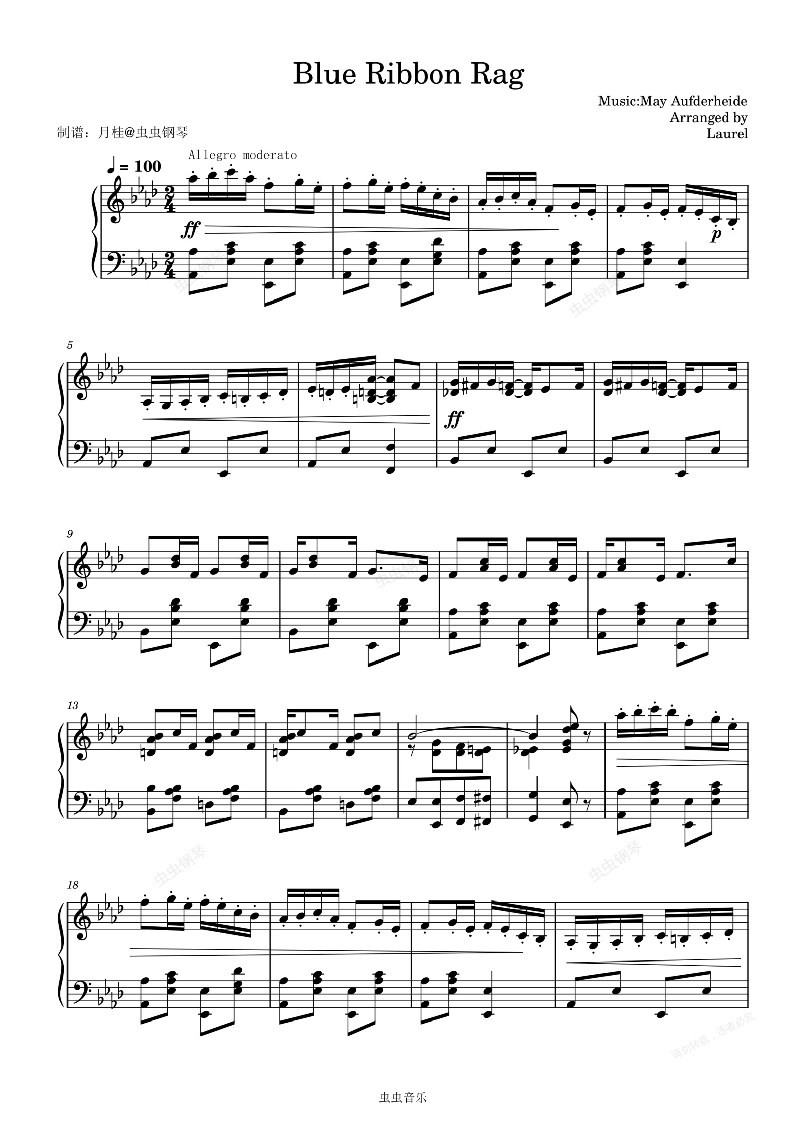 经典拉格泰姆()乐曲《Blue》,由女性作曲家May创作于1910年。拉格泰姆,美国流行音乐形式之一,为美国历史上第一个真正意义上的黑人音乐。产生于19世纪末,采用黑人旋律,依切分音法()循环主题与变形乐句等法则,结合而成的早期爵士乐,盛行于第一次世界大战前美国经济十分繁荣时期。发源于圣路易斯与新奥尔良,而后美国的南方和中西部开始流行,它影响了新奥尔良传统爵士乐的独奏与即兴演奏风格。