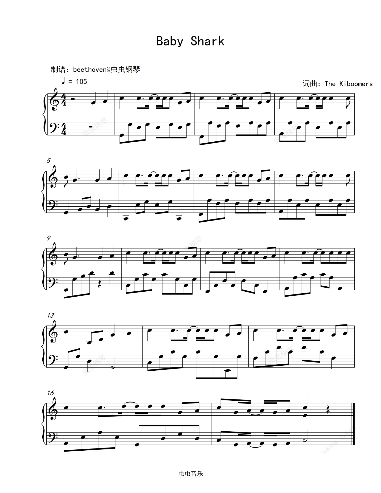 钢琴谱:Baby Shark-鲨鱼宝宝-简单版-The Kiboomers