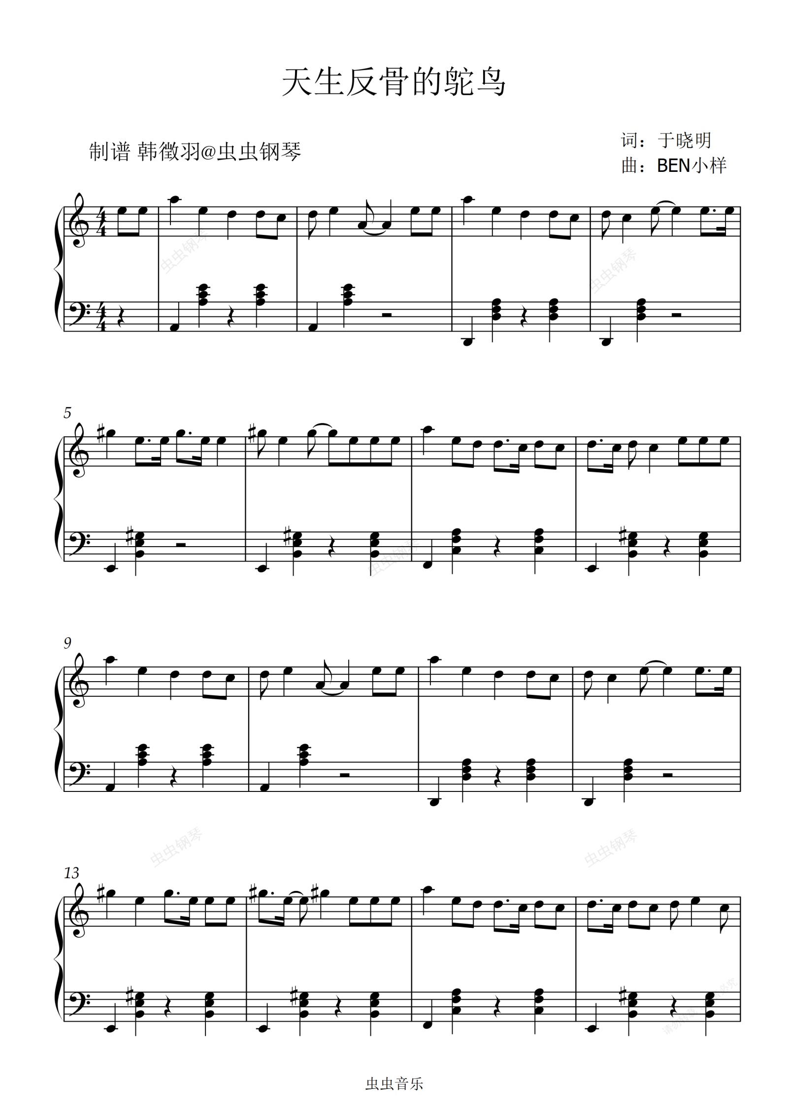 钢琴谱:天生反骨的鸵鸟 毛毛不插电