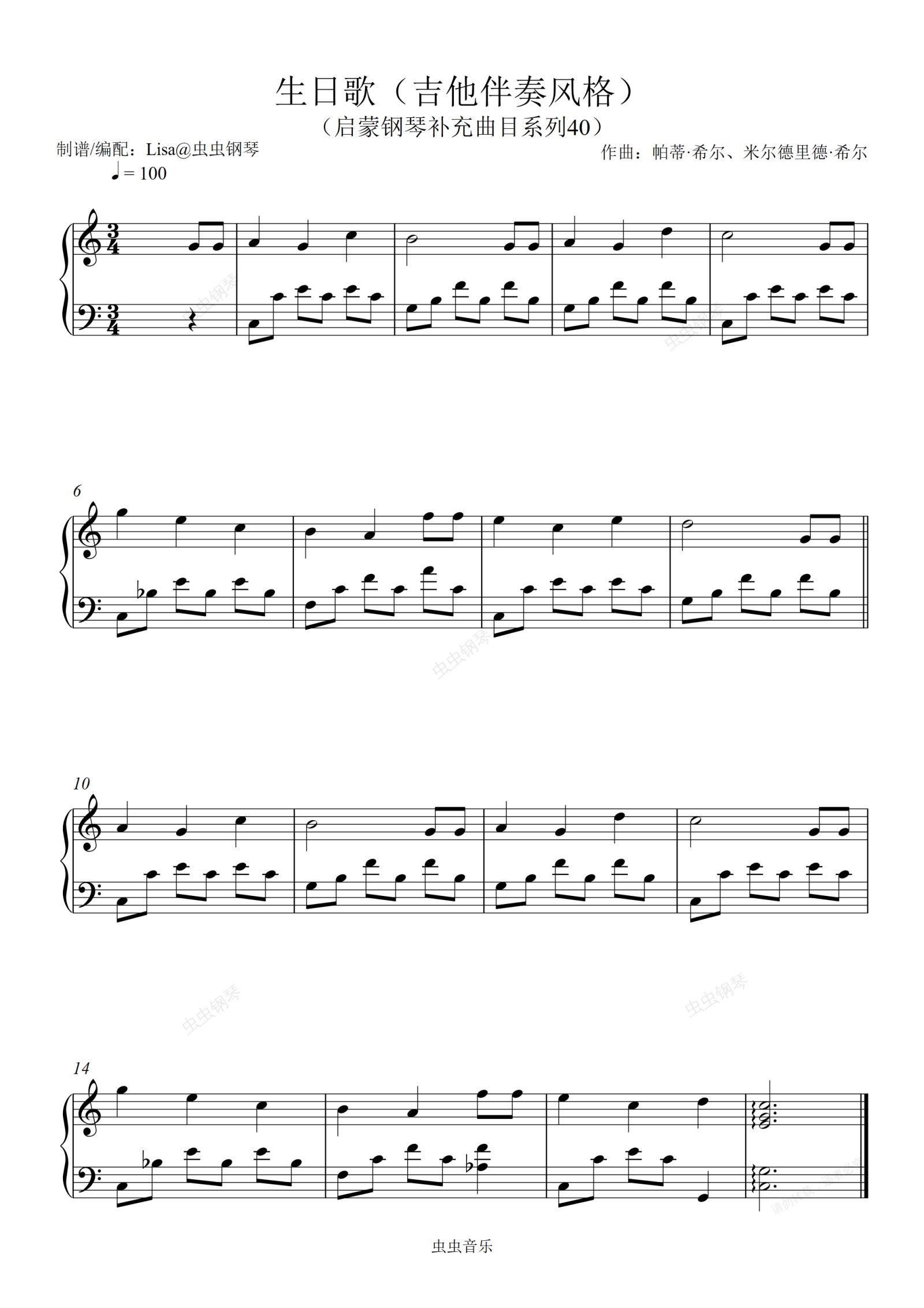 钢琴谱:生日歌(小汤3水平,吉他伴奏风格版)