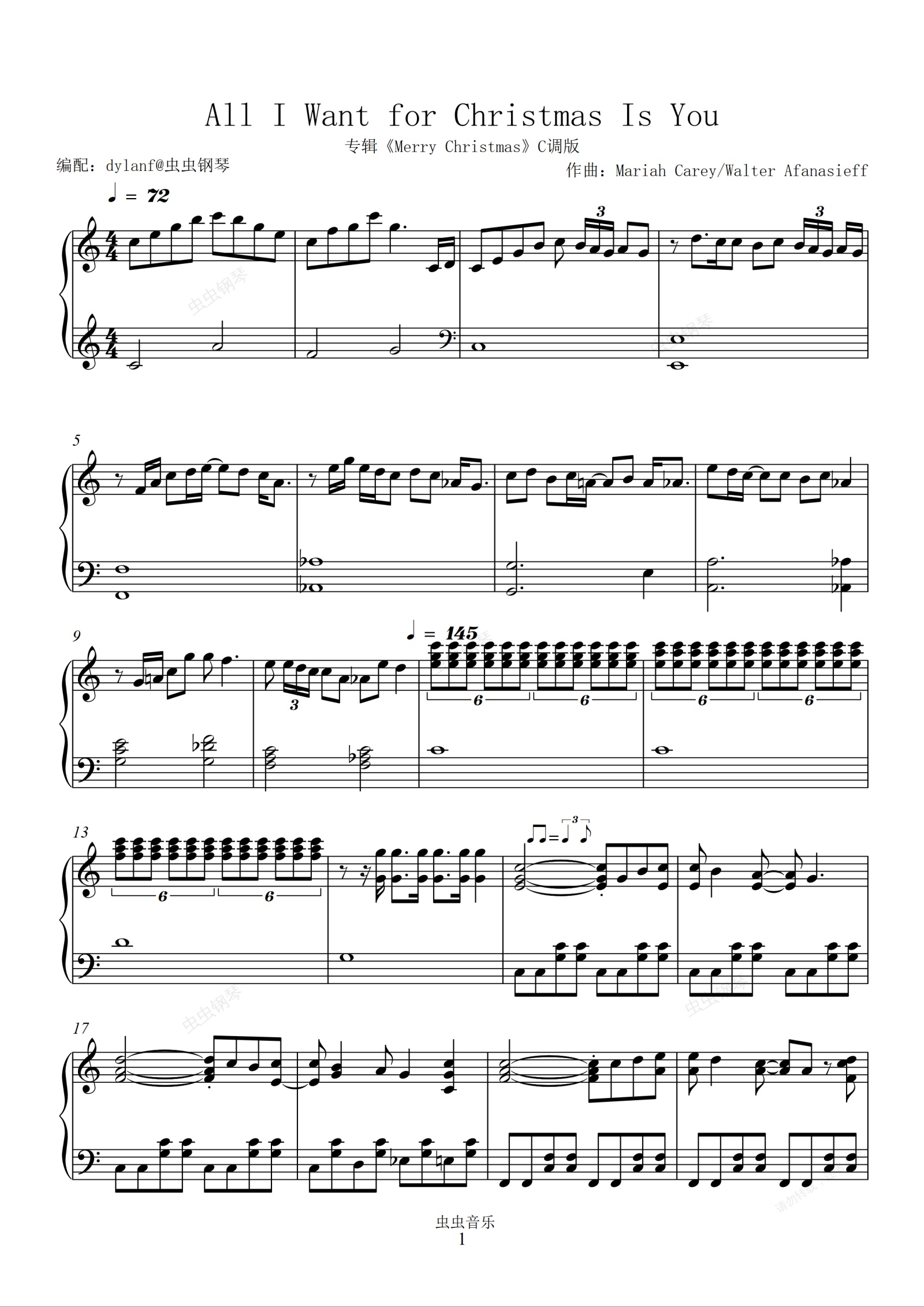 钢琴谱:C调All I Want for Christmas Is You(经典版)圣诞快乐 Merry Christmas Mariah Carey
