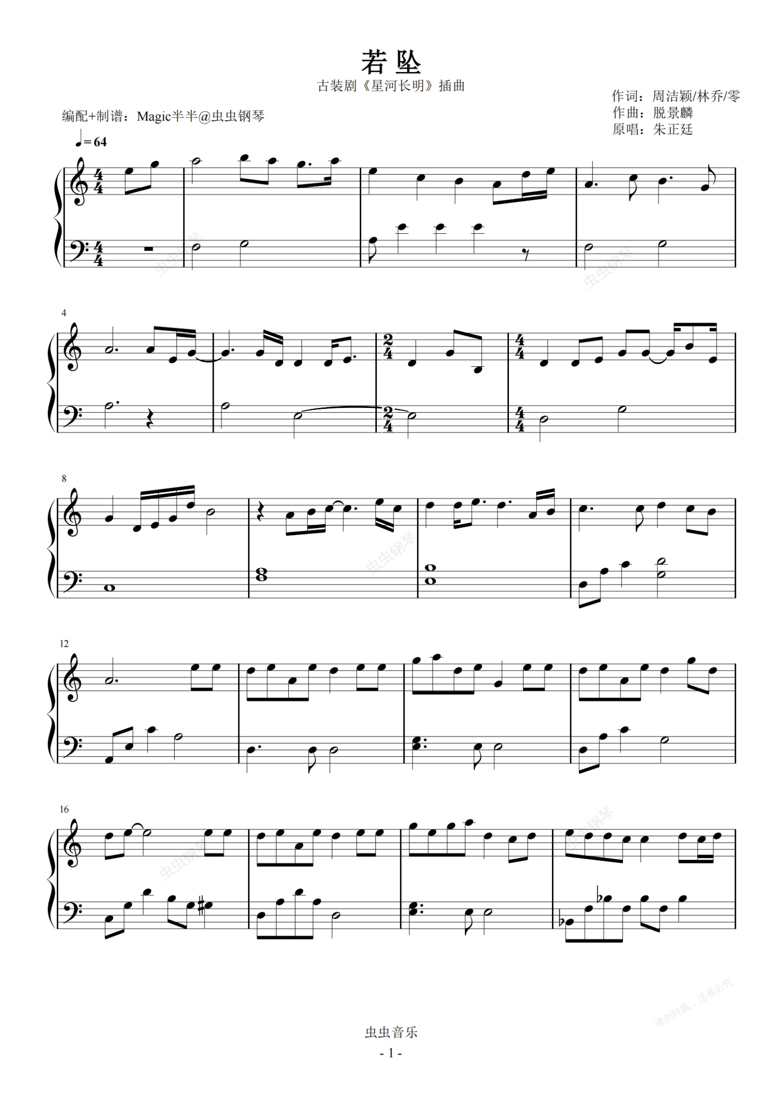 钢琴谱:若坠(C调) 朱正廷
