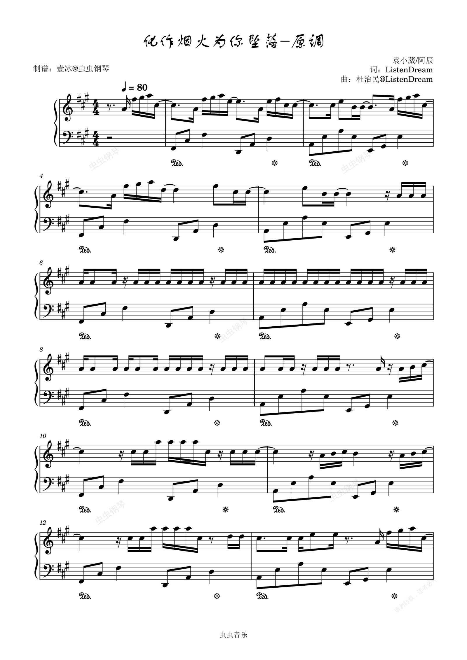 钢琴谱:化作烟火为你坠落//袁小葳/阿辰-原调