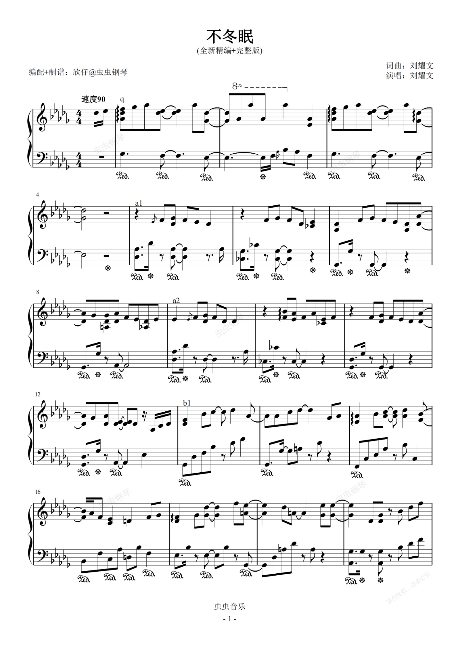 钢琴谱:刘耀文-降D《不冬眠》(全新精编+完整版)