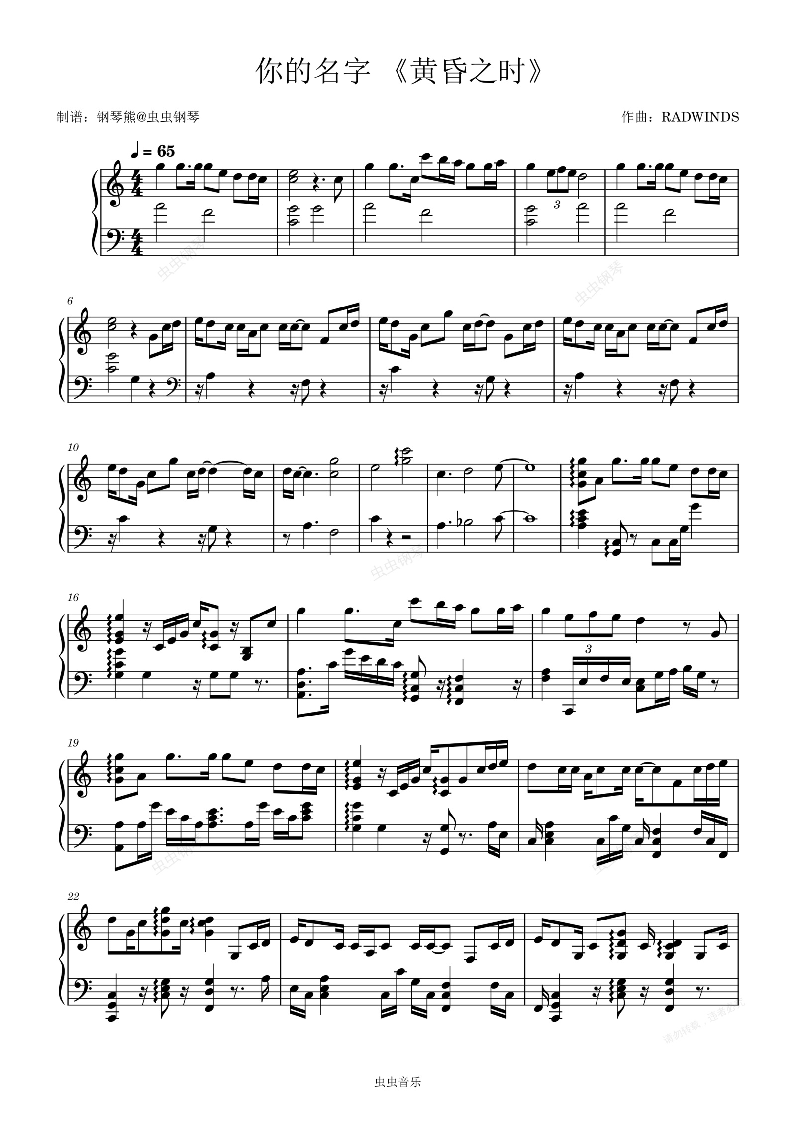 钢琴谱:O叔版~《黄昏之时》你的名字