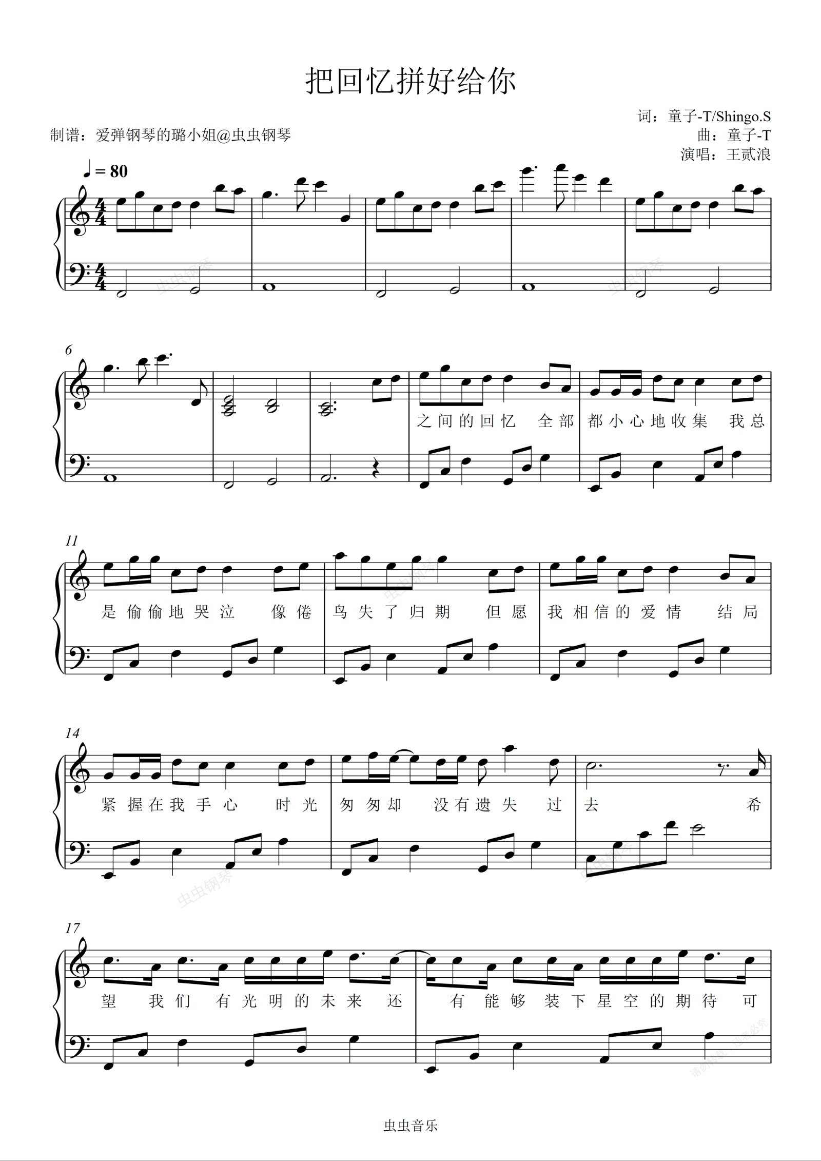 钢琴谱:把回忆拼好给你 - C调简单版 - 附歌词(无删减)