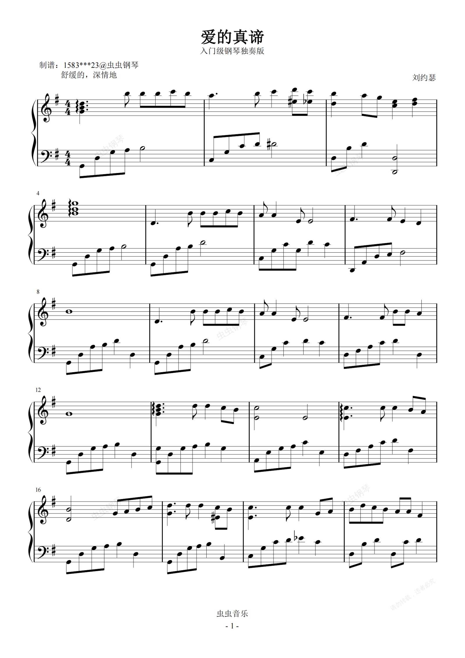 钢琴谱:爱的真谛 G调简易版