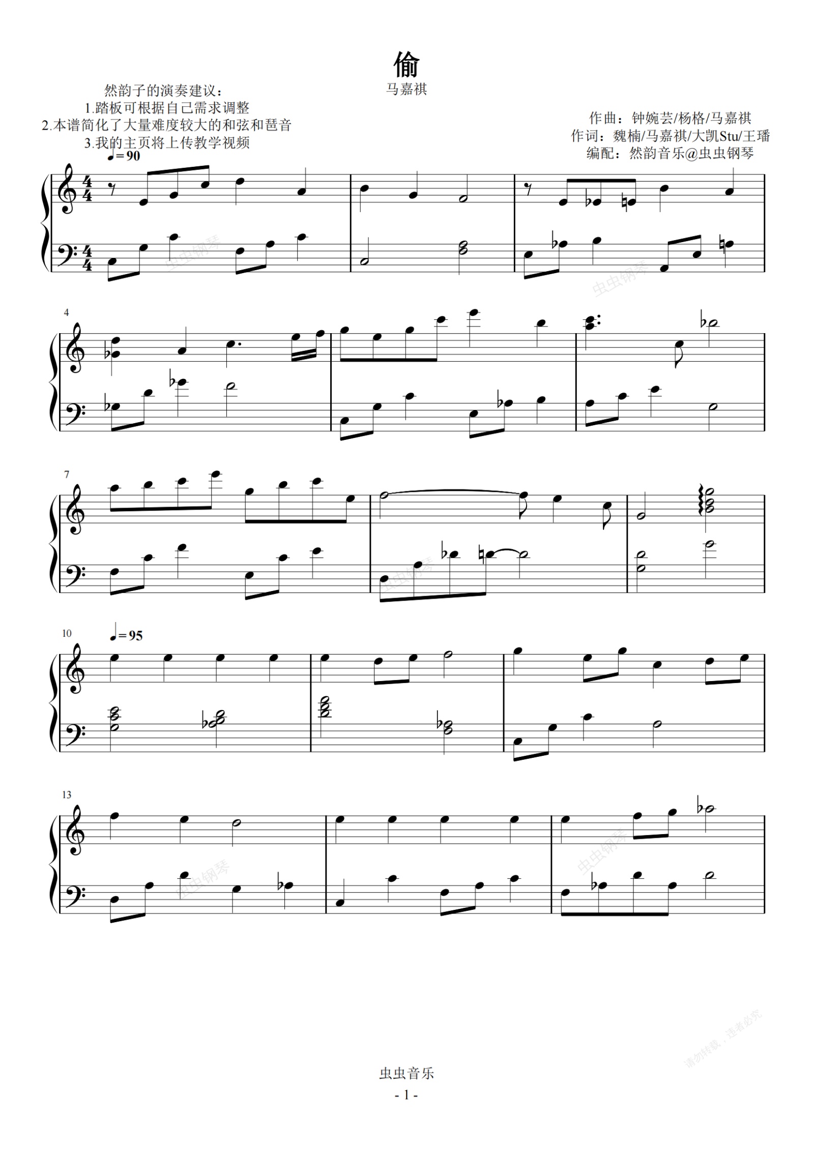 钢琴谱:【C调|简单版】偷-马嘉祺 钢琴独奏易上手 然韵音乐编配