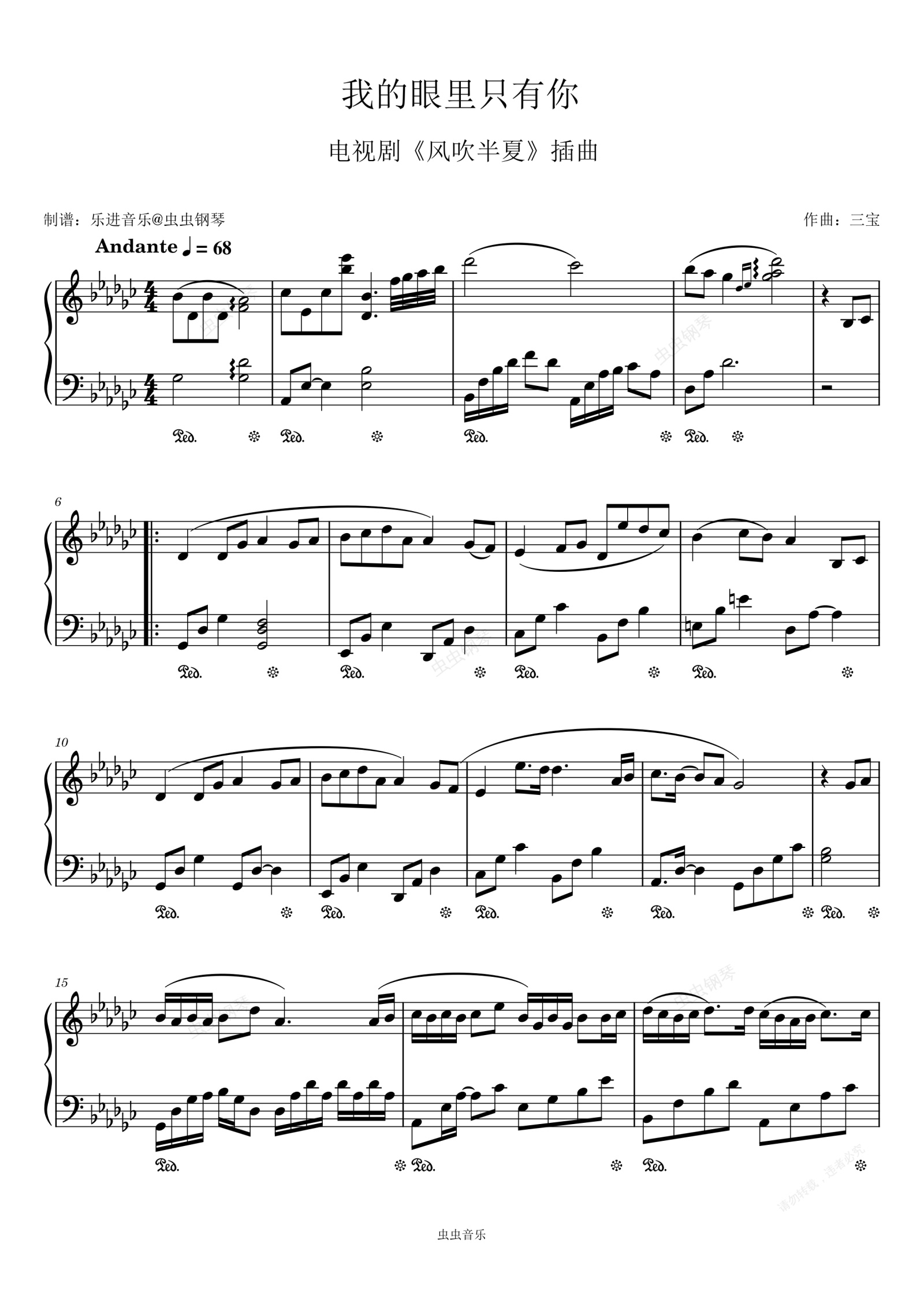 钢琴谱:《我的眼里只有你》原调 风吹半夏 插曲