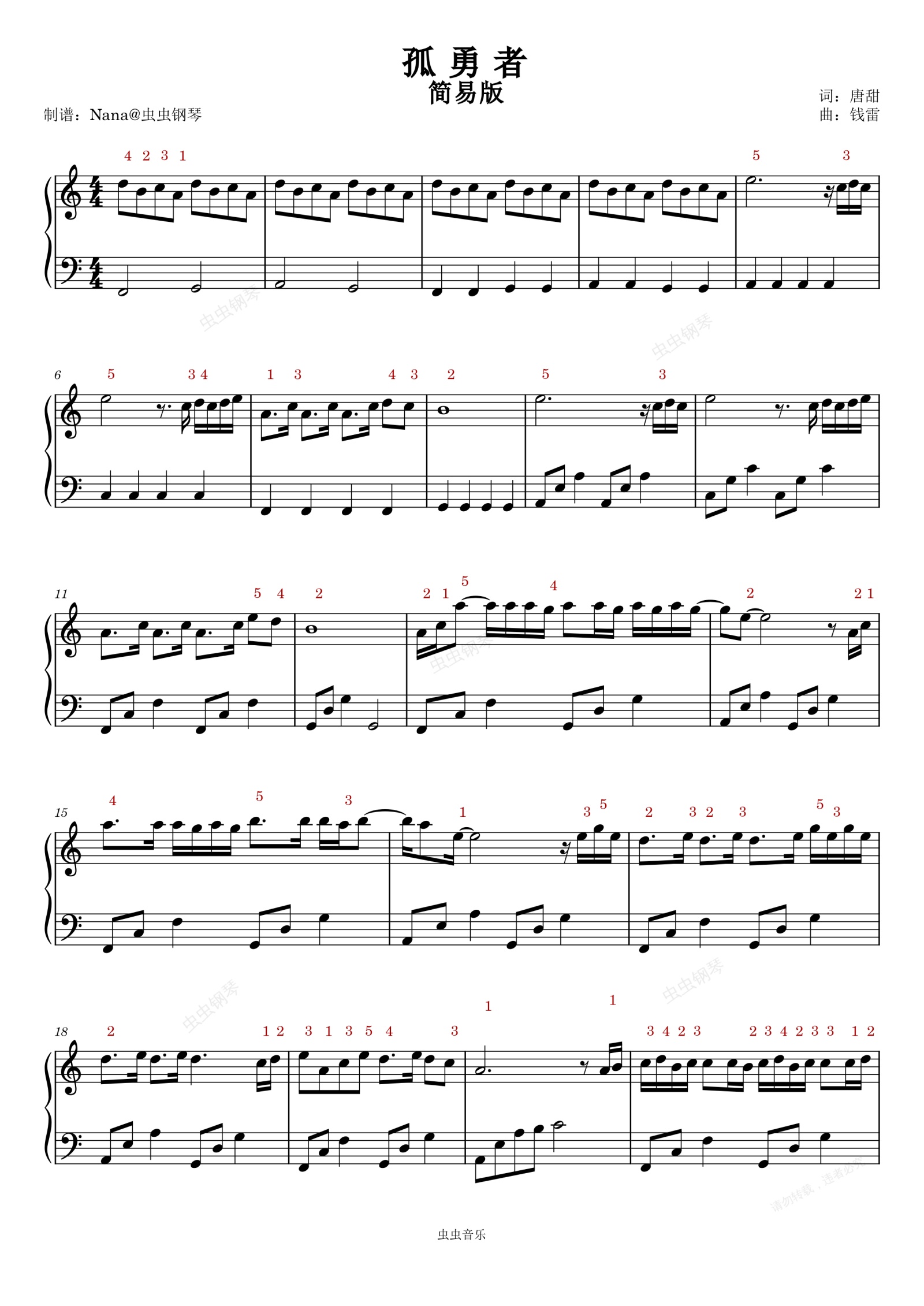 钢琴谱:《孤勇者》C调-带指法