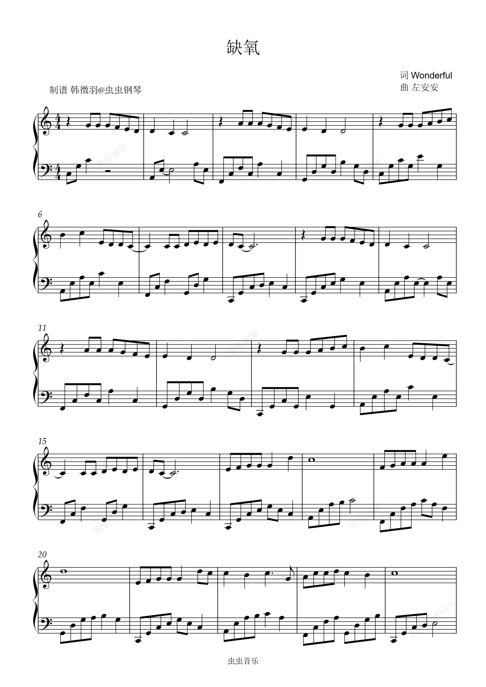 钢琴谱:缺氧 杨丞琳 C调简单易弹版