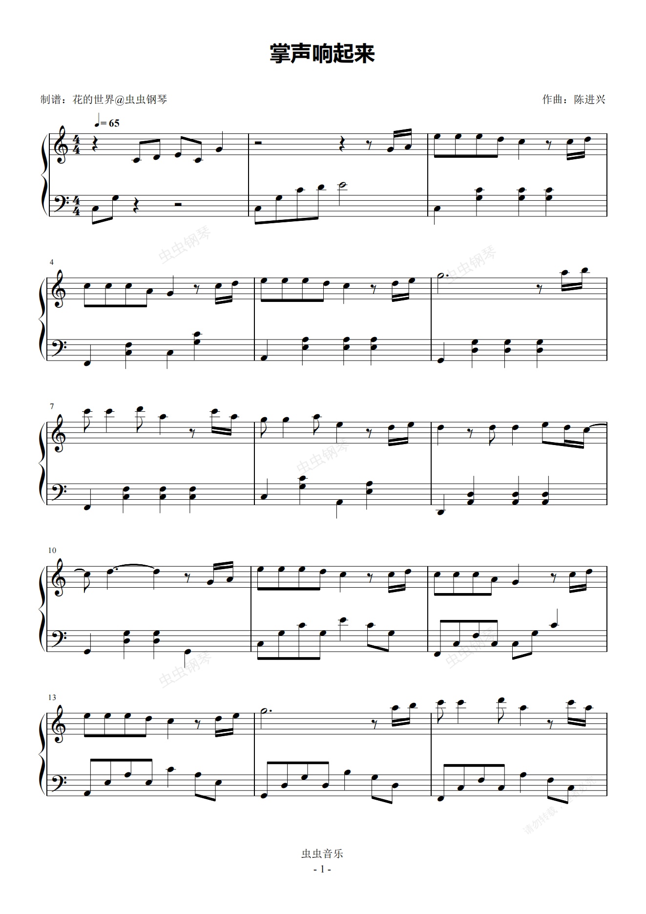 钢琴谱:掌声响起来 C调简易版 凤飞飞