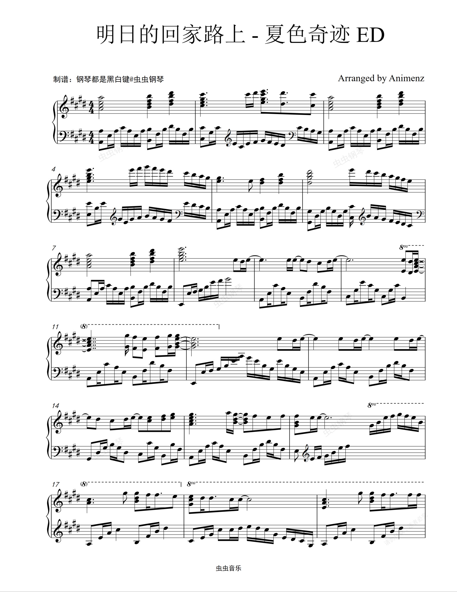钢琴谱:【Animenz版】明日的回家路上 - 夏色奇迹 ED【Ashita e no Kaerimichi】