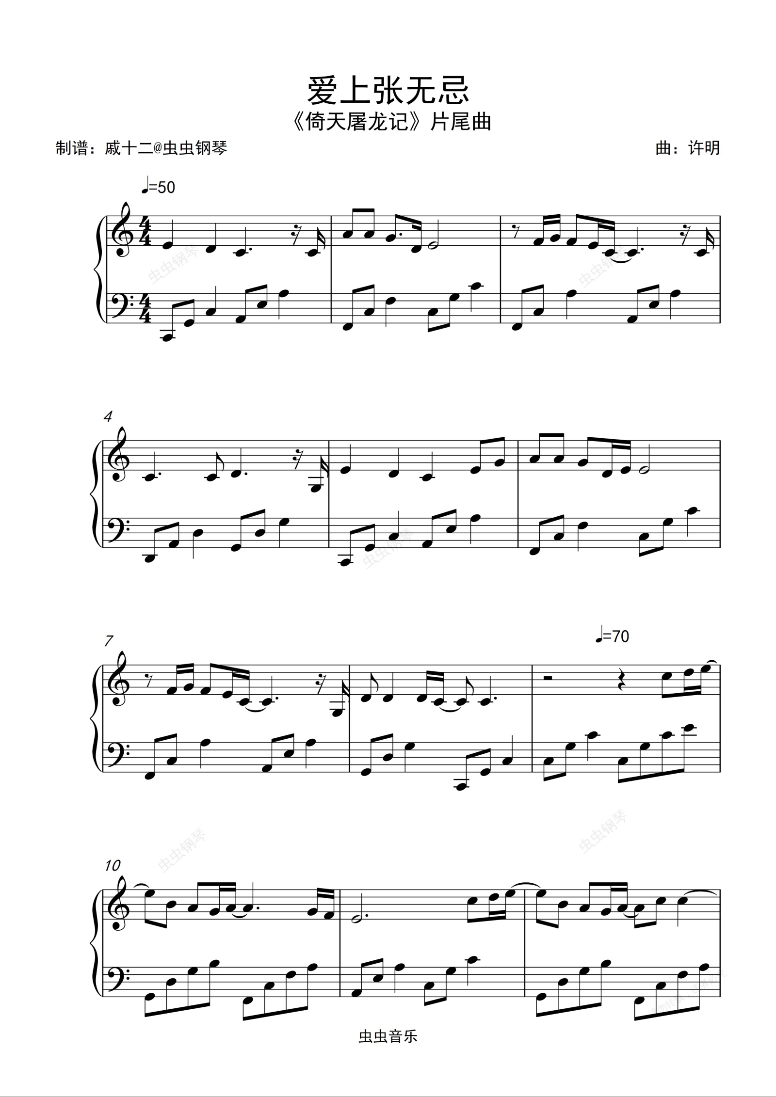 钢琴谱:爱上张无忌《倚天屠龙记》片尾曲-C调简单版