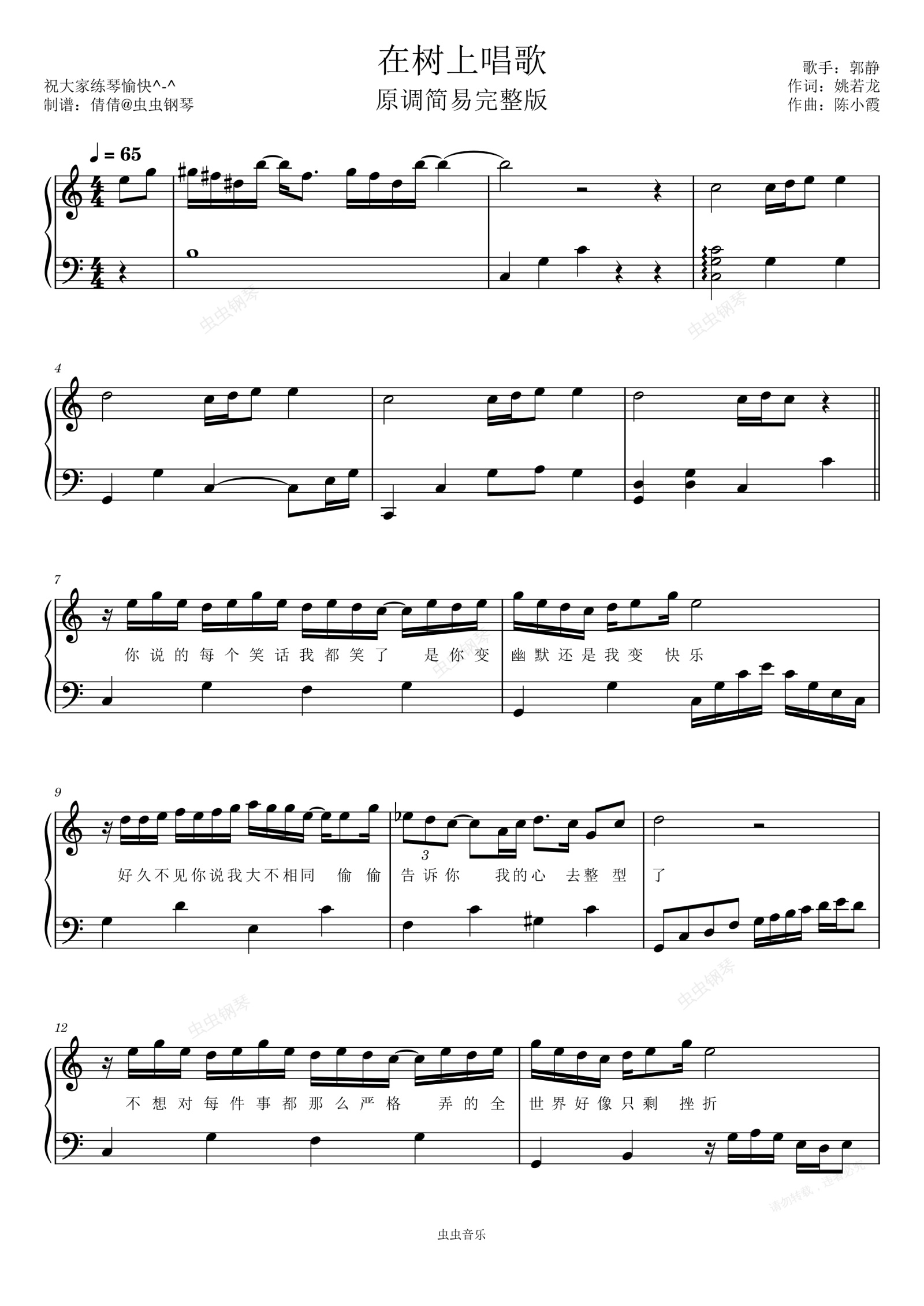 钢琴谱:在树上唱歌-C调完整简易版-郭静