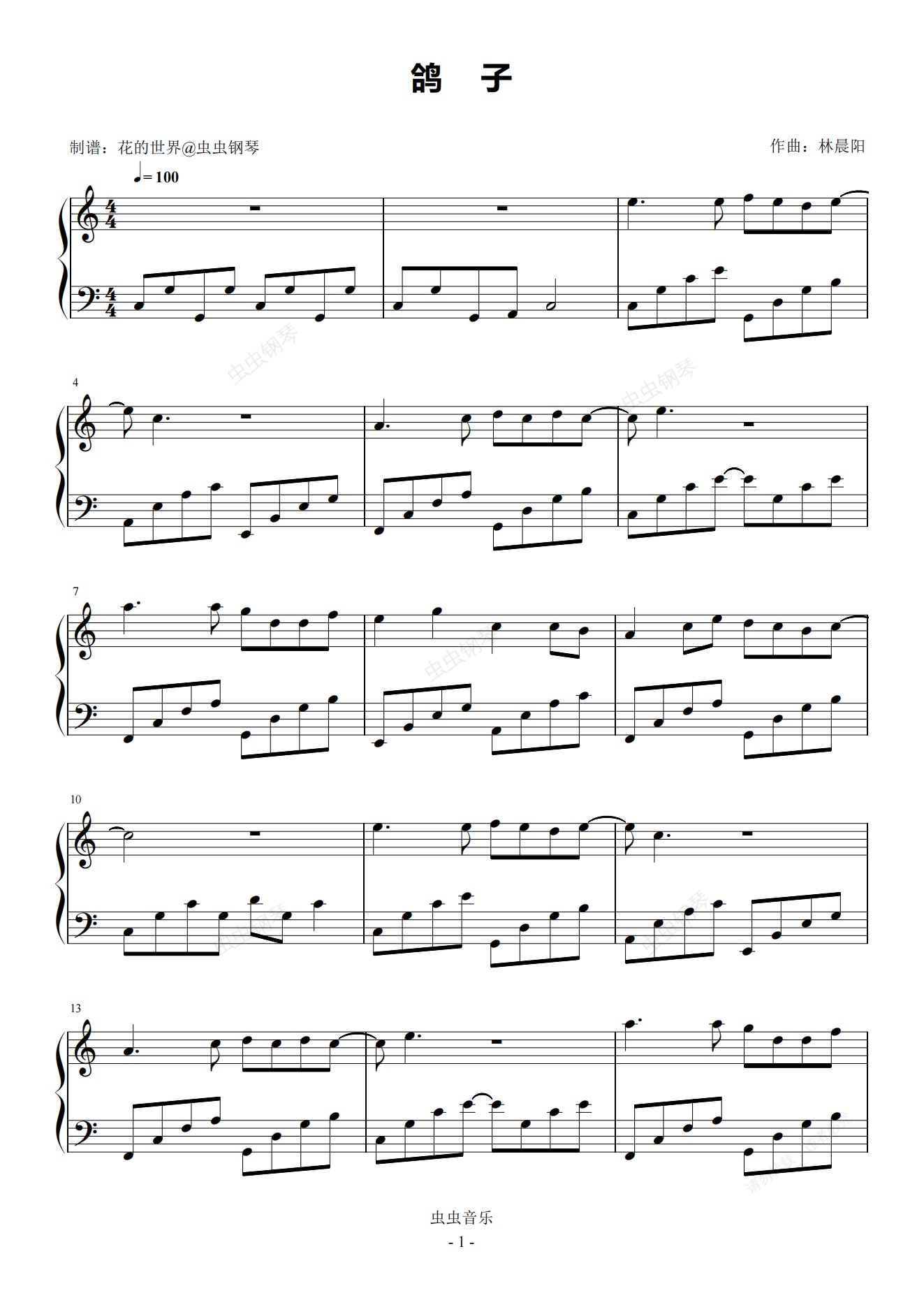 钢琴谱:鸽子 C调简易版  徐秉龙