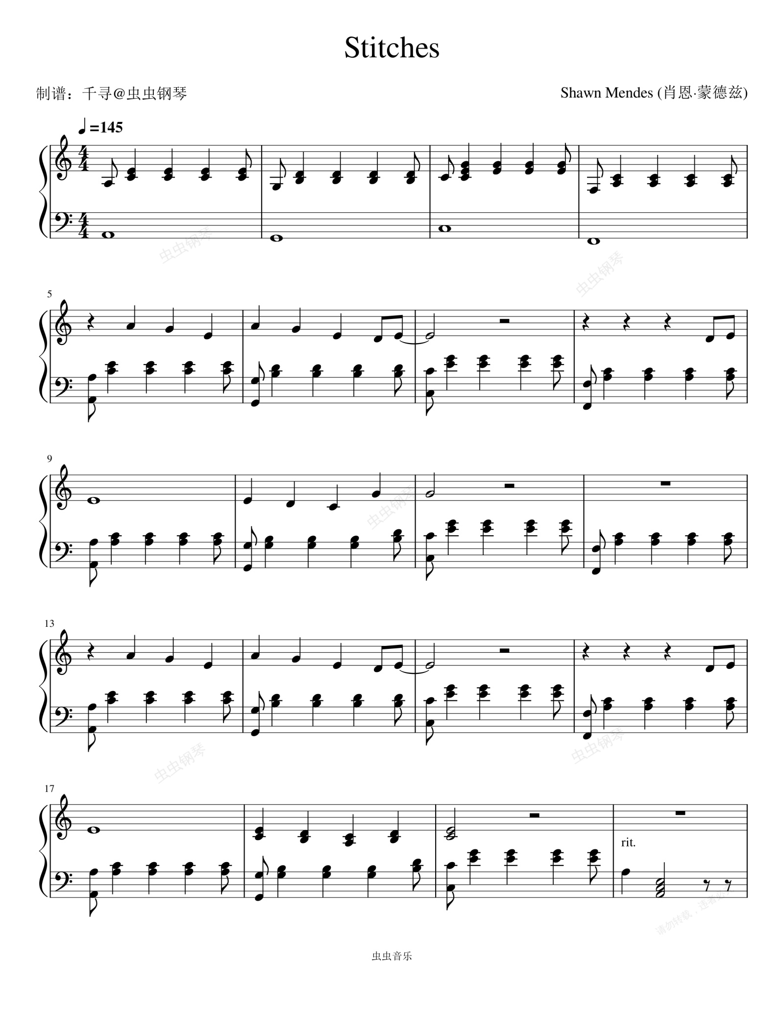 钢琴谱:Stitches - Shawn Mendes (肖恩·蒙德兹)