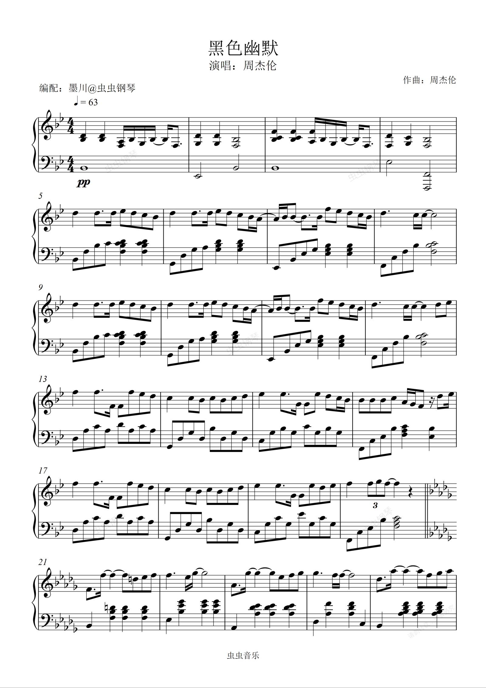 钢琴谱:黑色幽默—周杰伦—降B调编配