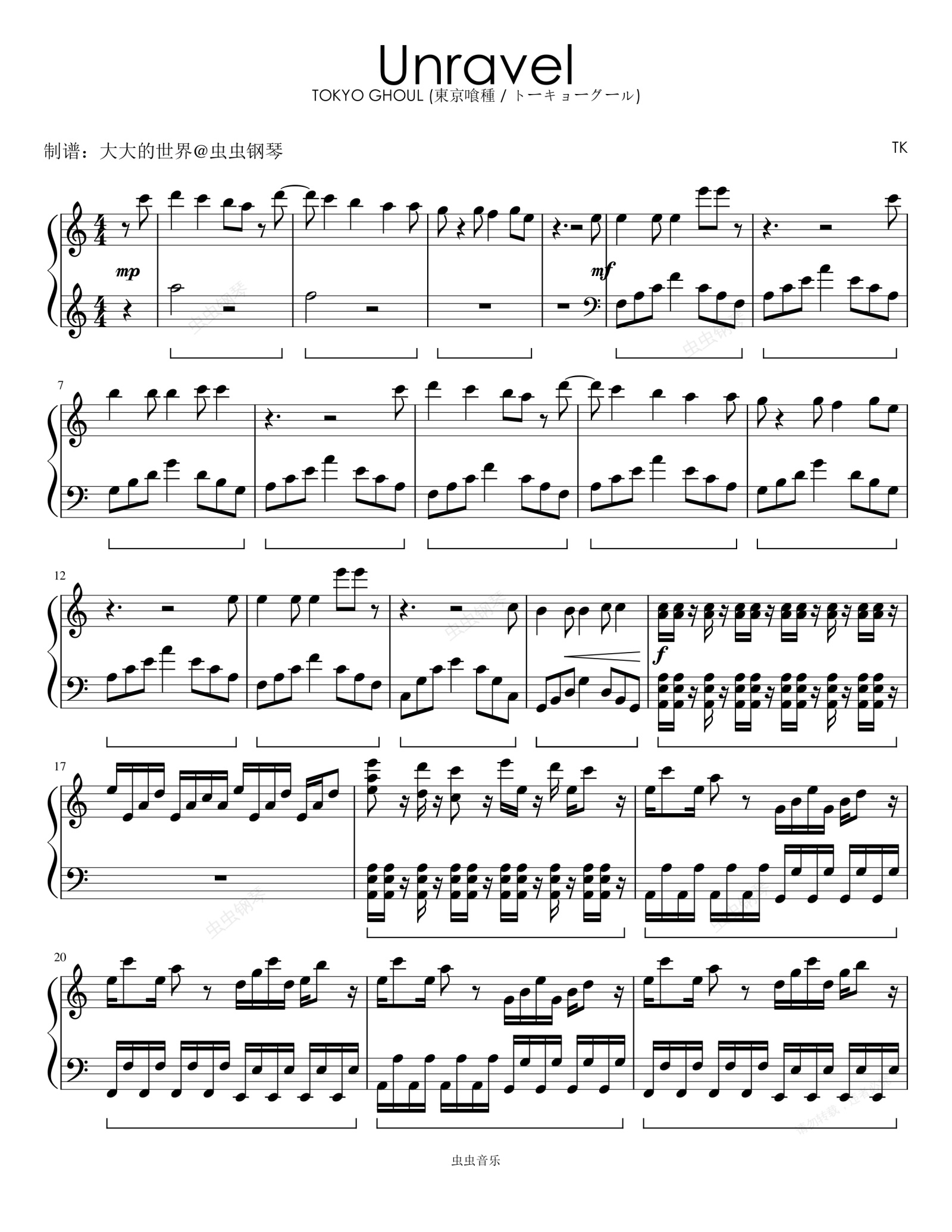 钢琴谱:《Unravel》东京喰种 -C调简易版