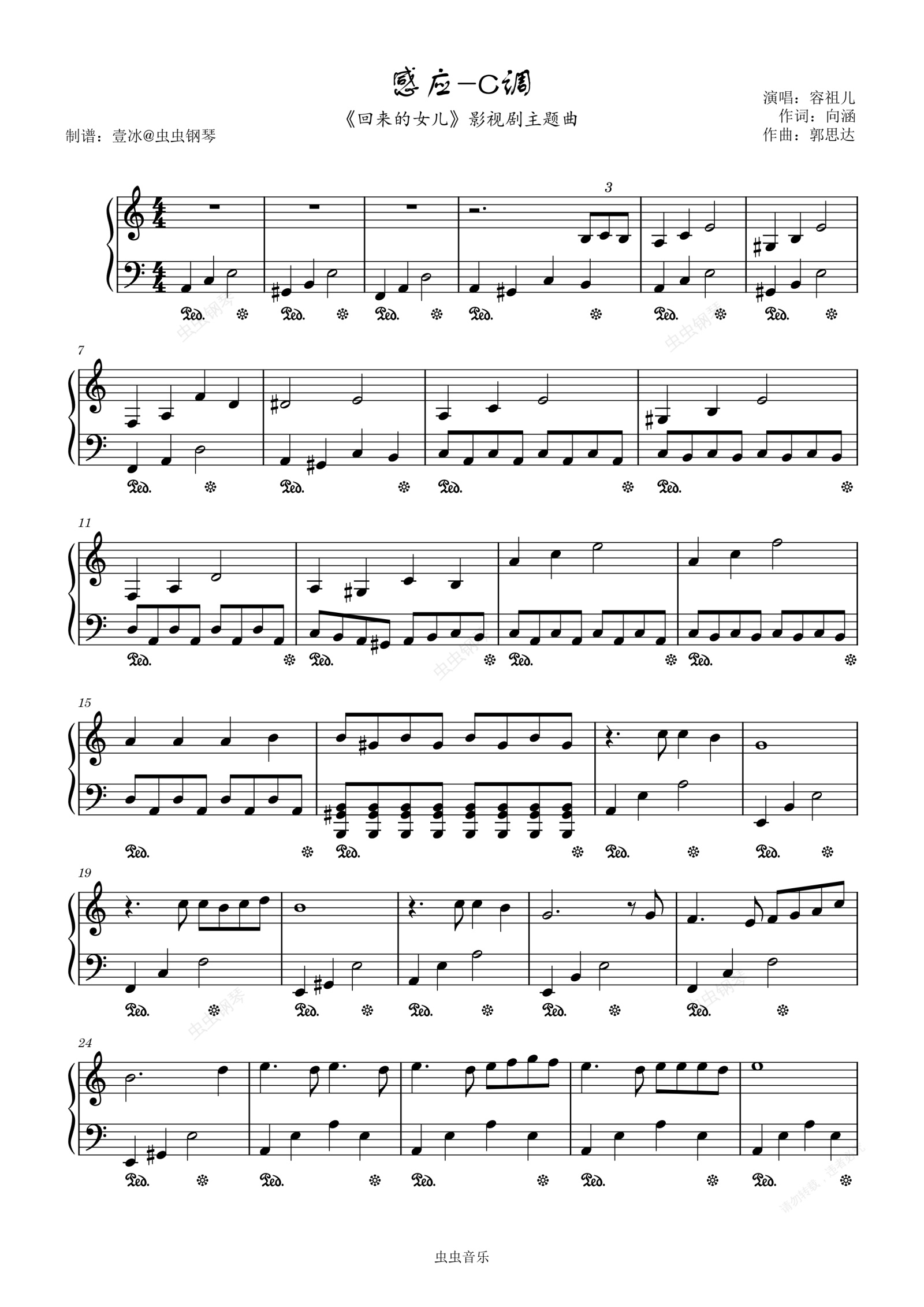 钢琴谱:感应//《回来的女儿》影视剧主题曲-C调