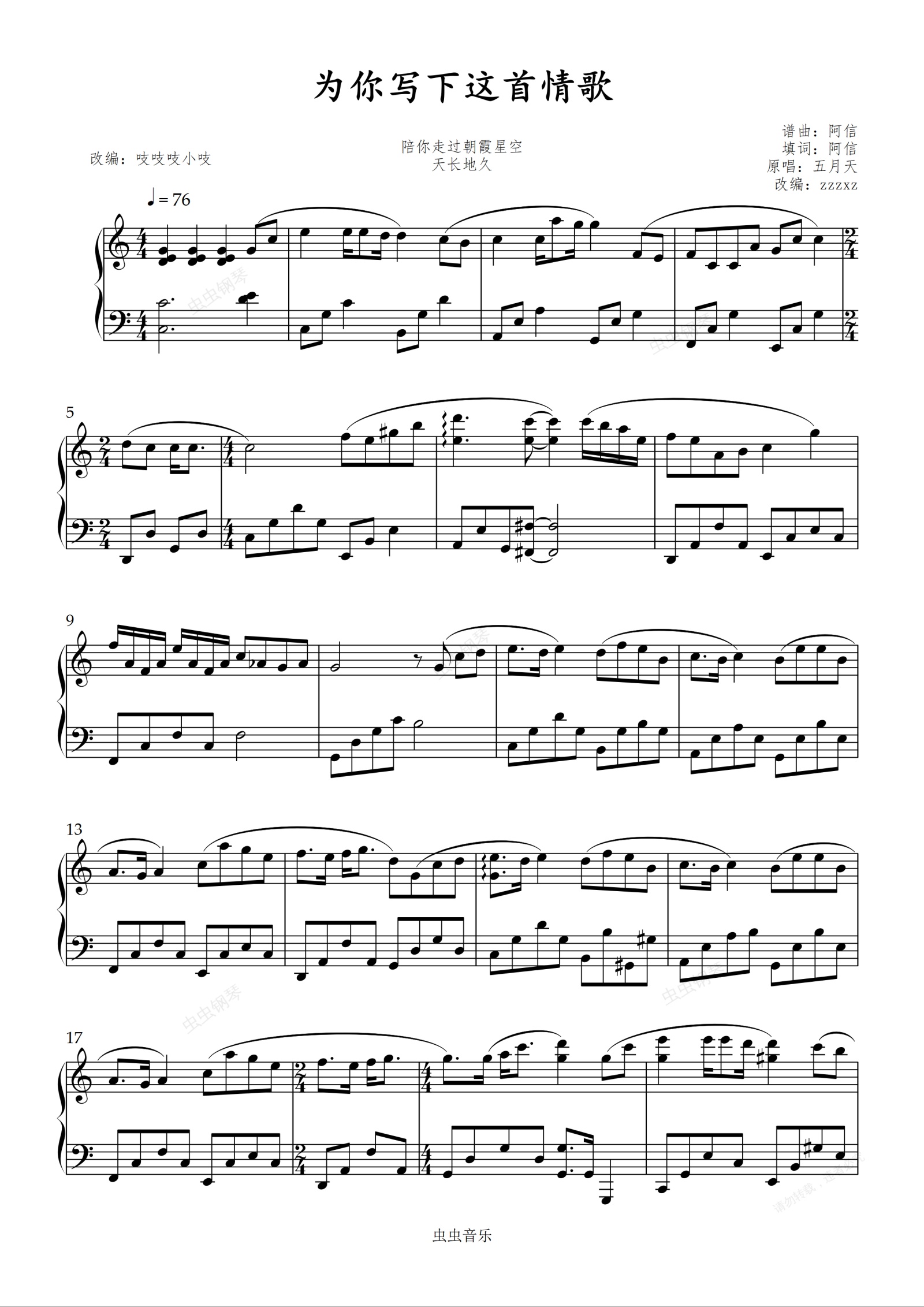 钢琴谱:为你写下这首情歌-C-五月天 【初级难度】 吱吱编配