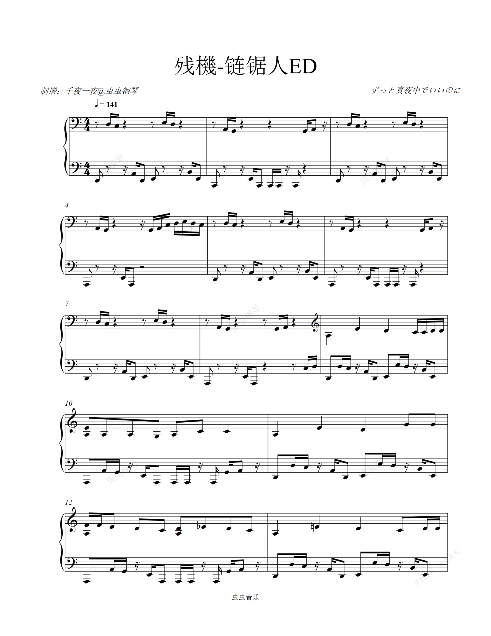 钢琴谱:《电锯人》第2话ED「残機」 钢琴 / ZUTOMAYO ずっと真夜中でいいのに