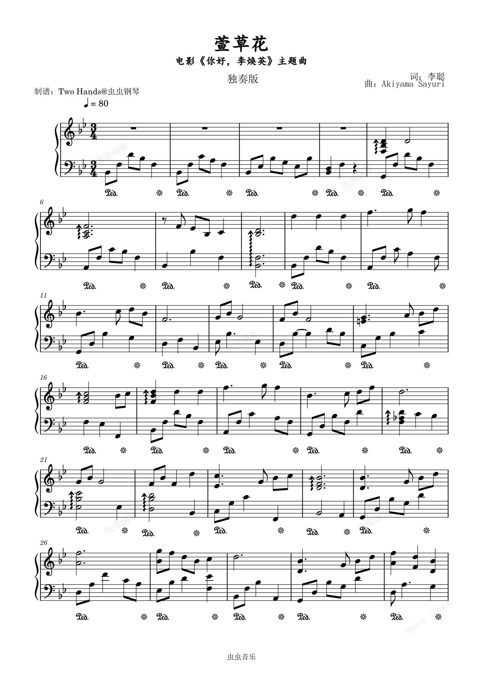 钢琴谱:钢琴演奏版【萱草花 - 张小斐】原调 TwO HandS改编