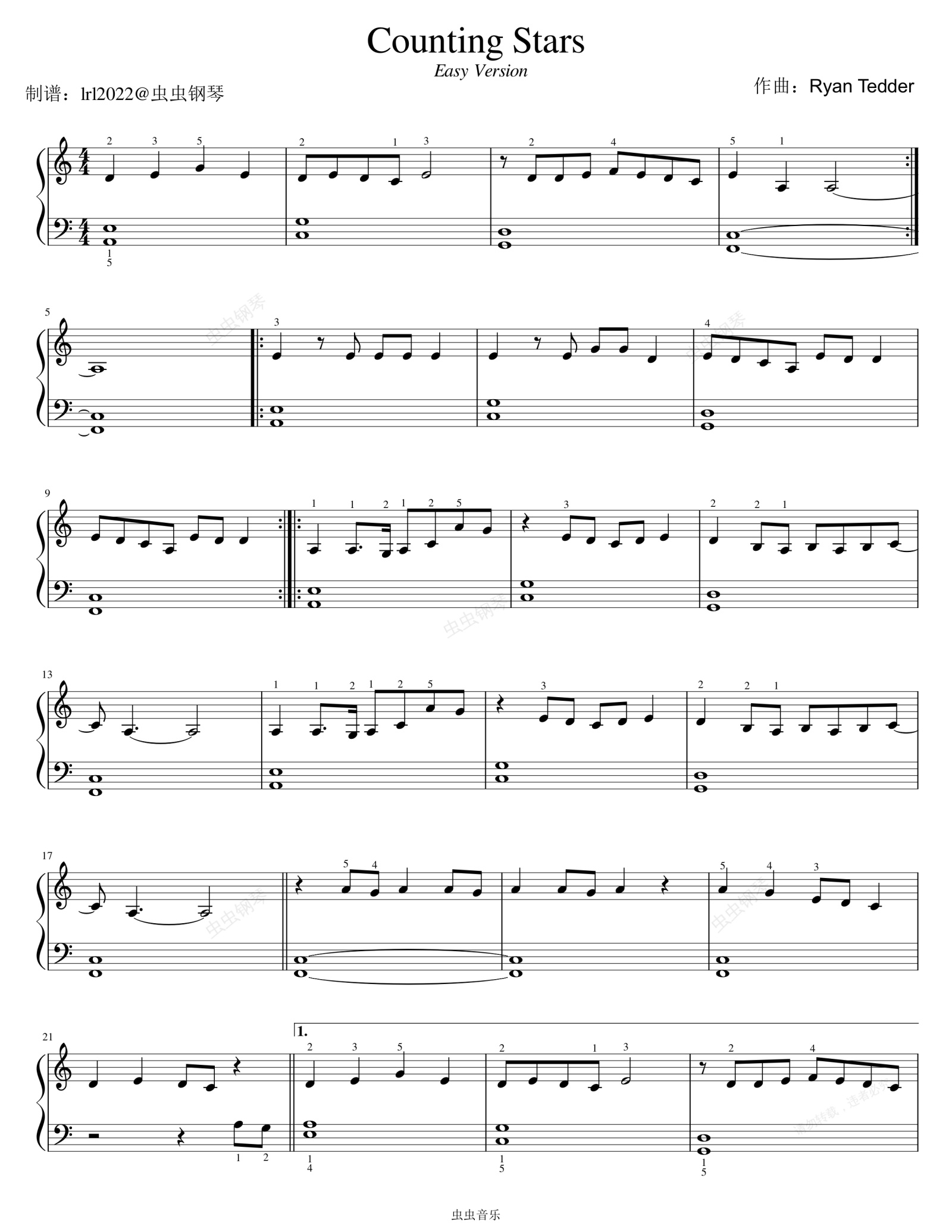 钢琴谱:Counting Stars -带指法独奏谱-Onerepublic