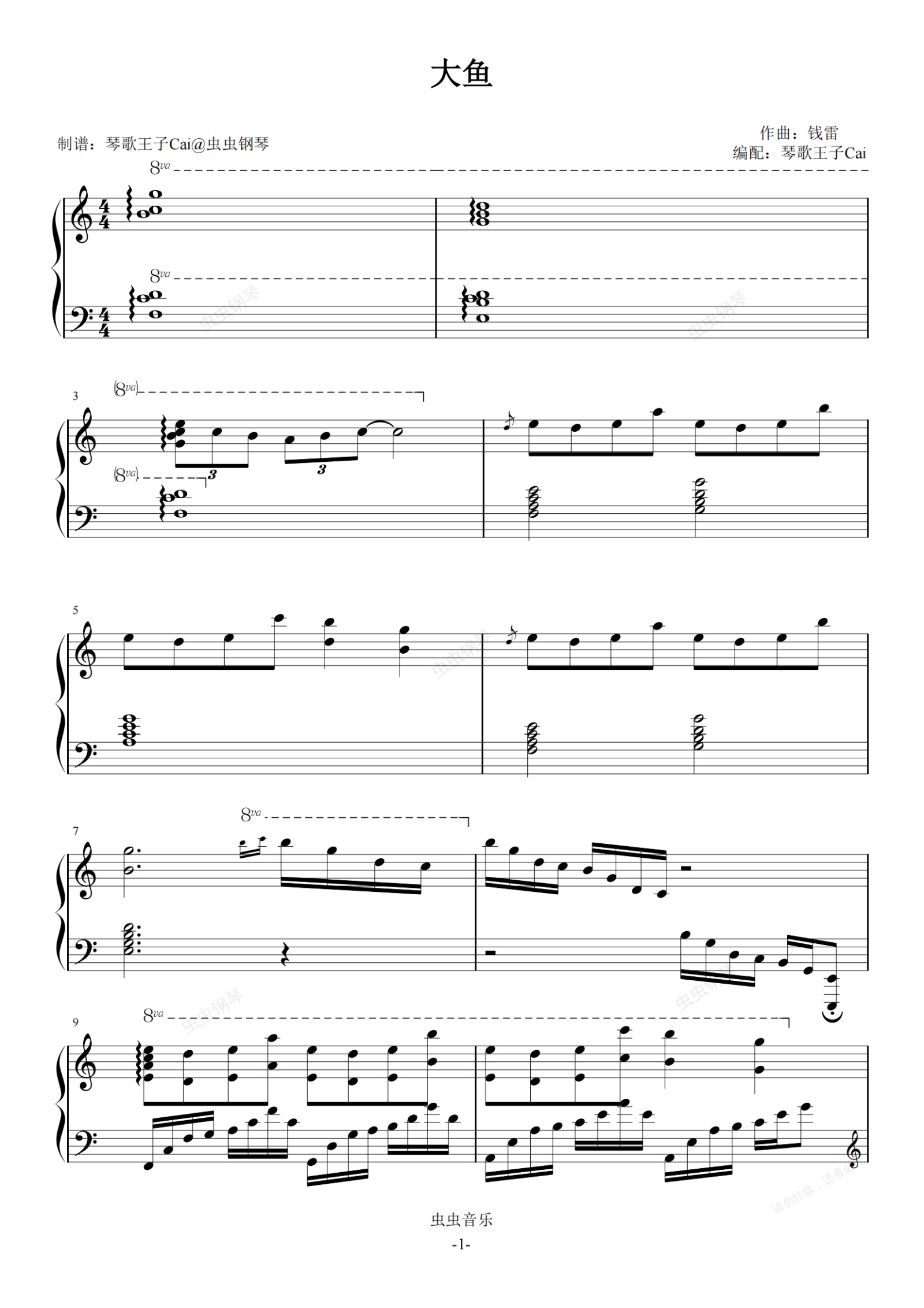 钢琴谱:大鱼(好听有点难)琴歌王子Cai钢琴版C调