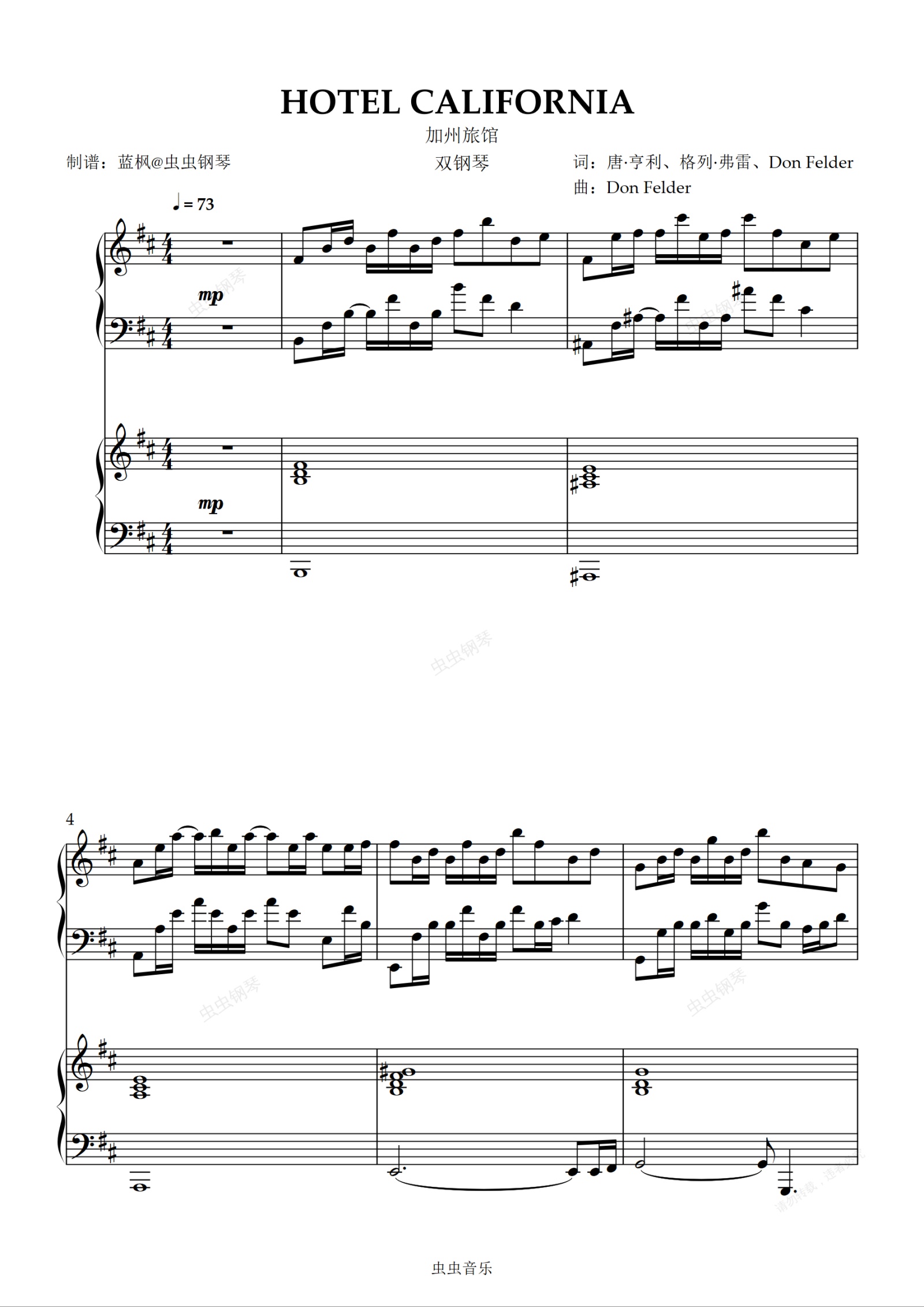 钢琴谱:(双钢琴)HOTEL CALIFORNIA 加州旅馆——传唱了近半个世纪,依然魅力不减!