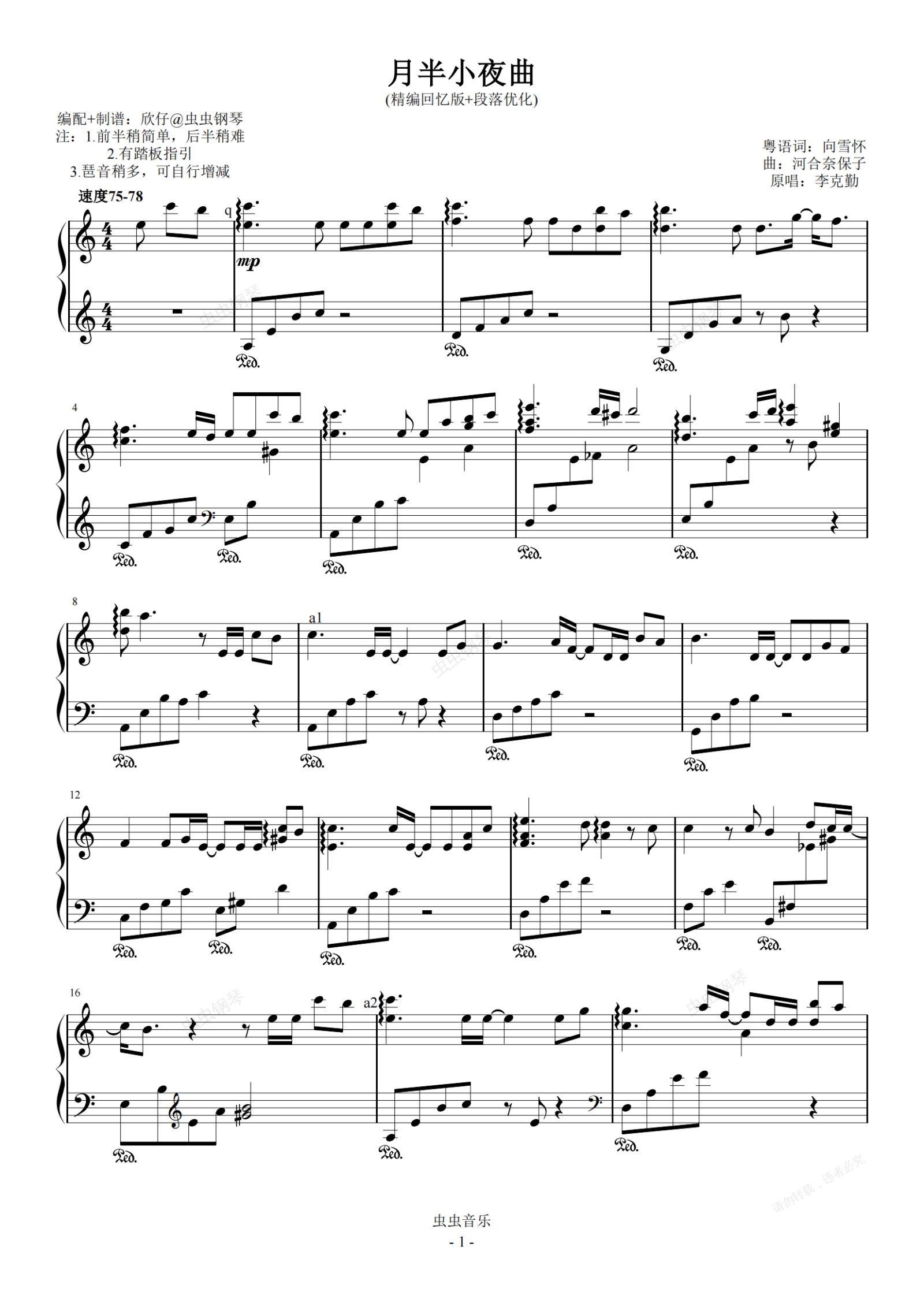 钢琴谱:李克勤-a《月半小夜曲》(精编回忆+段落优化)