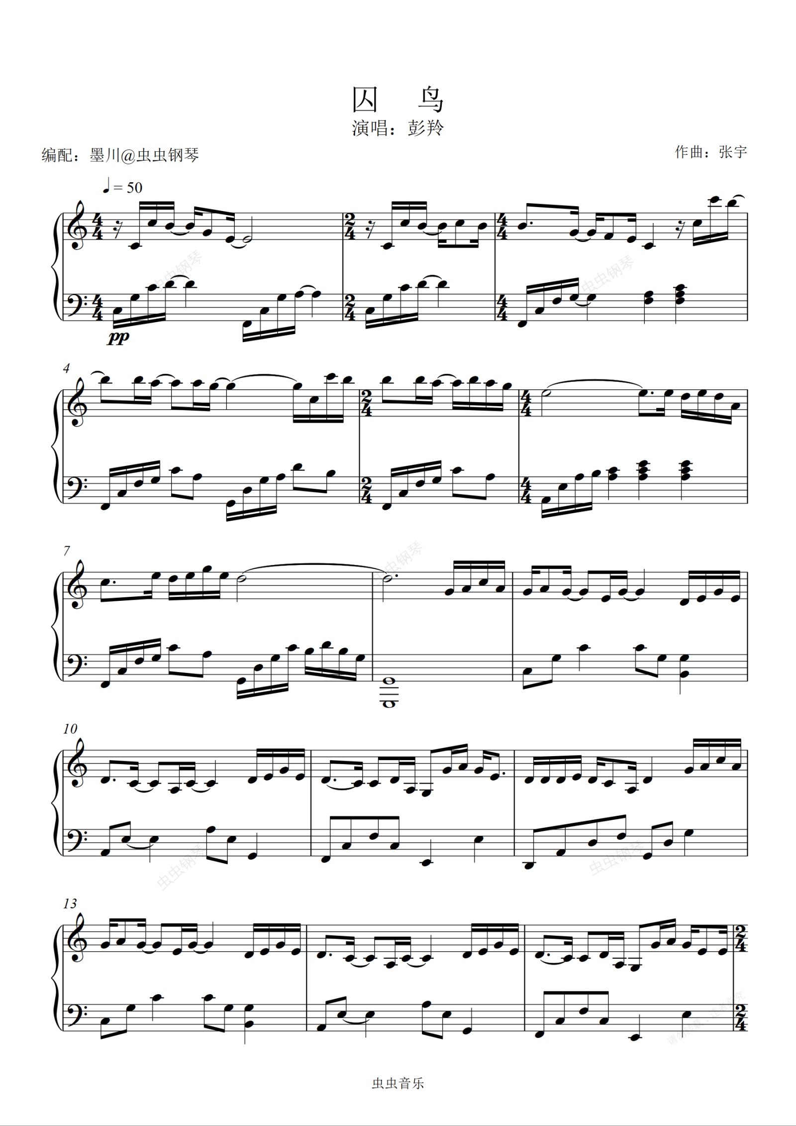 钢琴谱:囚鸟—彭羚、张宇—C调编配