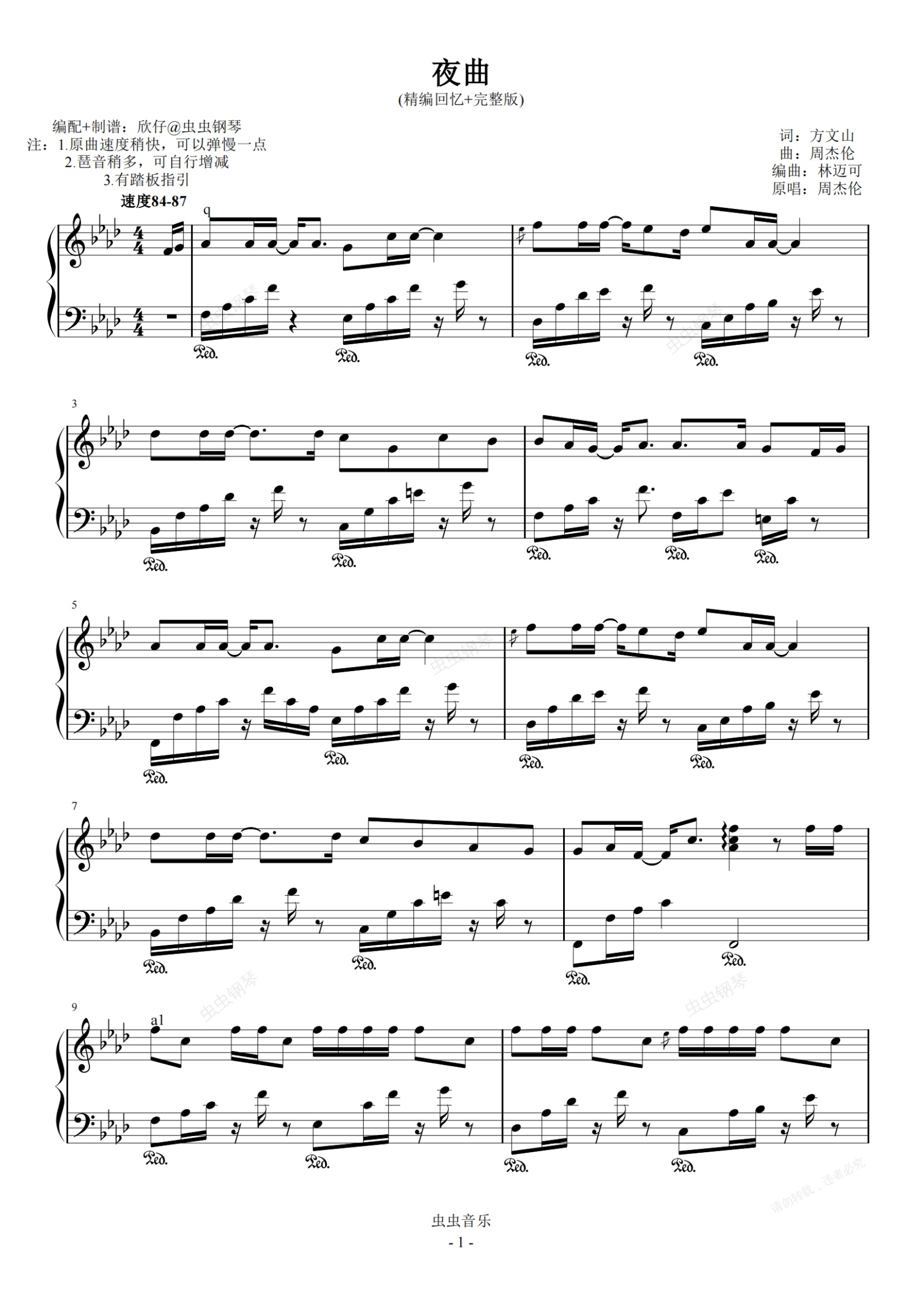 钢琴谱:周杰伦-f《夜曲》(精编回忆+完整版)