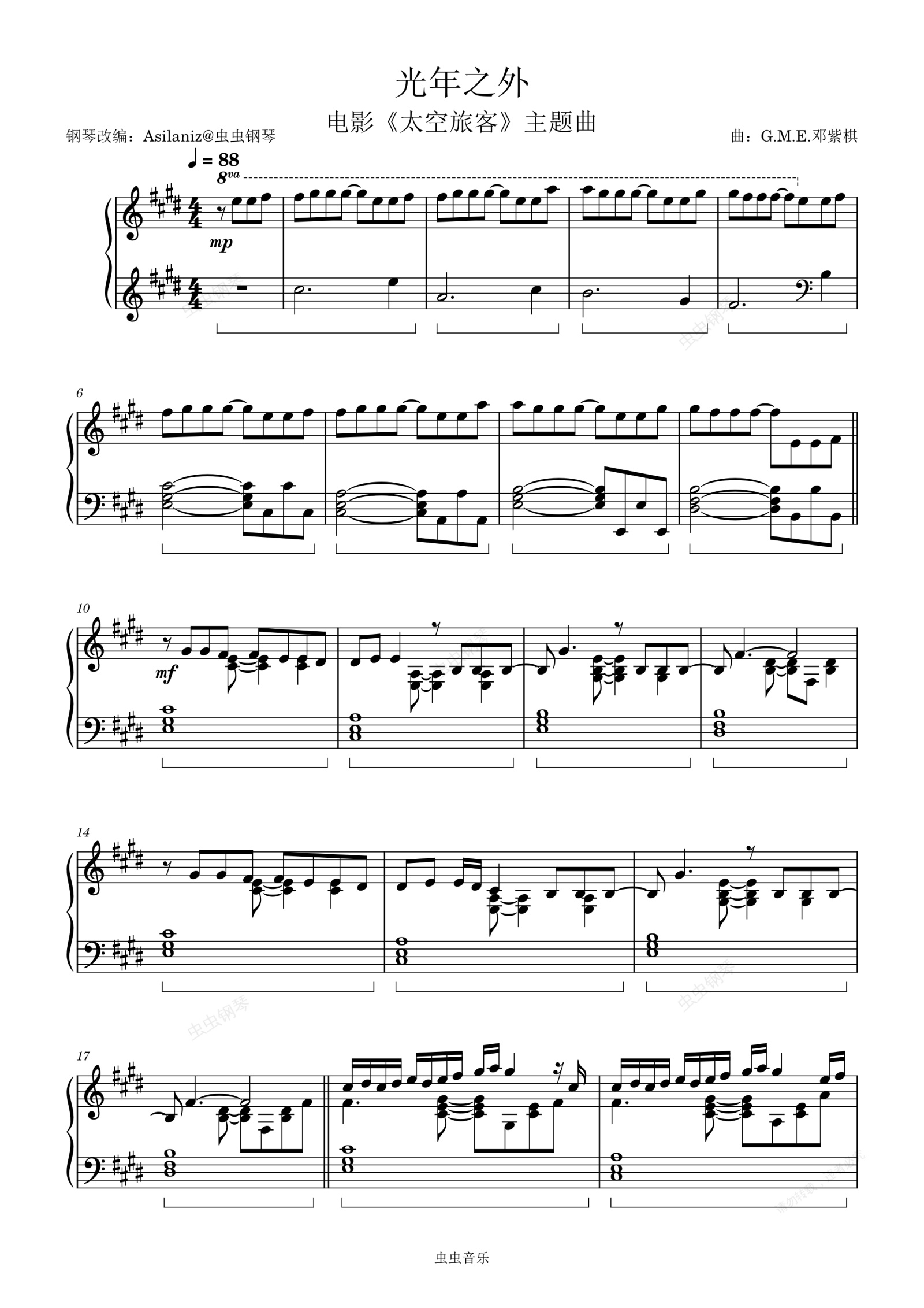 钢琴谱:光年之外,还原了多声部且简化了一些地方,虽然依然比较复杂,但相对于我自己弹的还是简单了很多